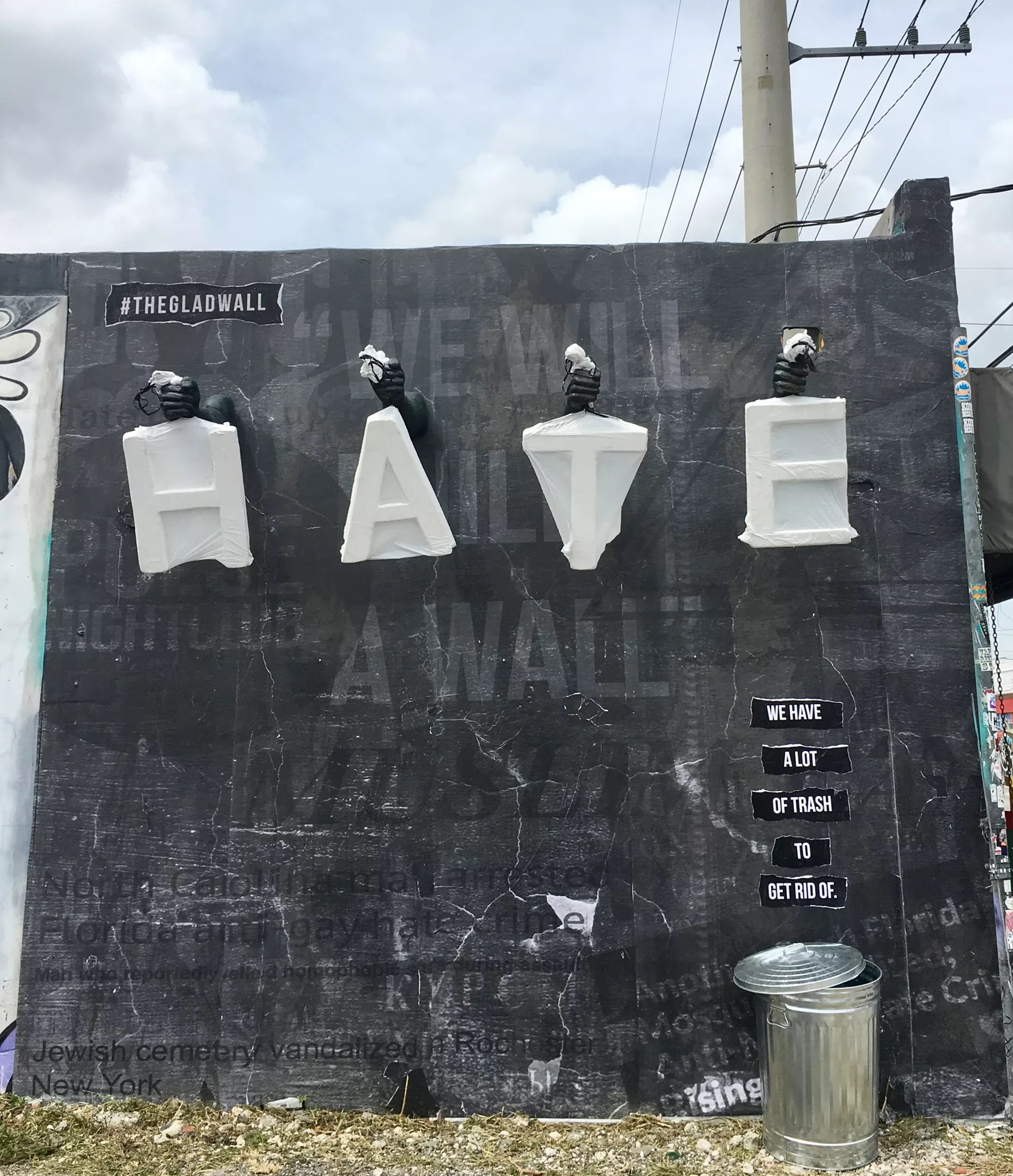 The Glad Wall, located on NW Second Avenue between NW 26th and 24th Streets, features four arm sculptures, painted black, protruding from the mural. Each holds a white trash bag, through which viewers can see the outline of an alphabetic letter. Together, they spell H-A-T-E.