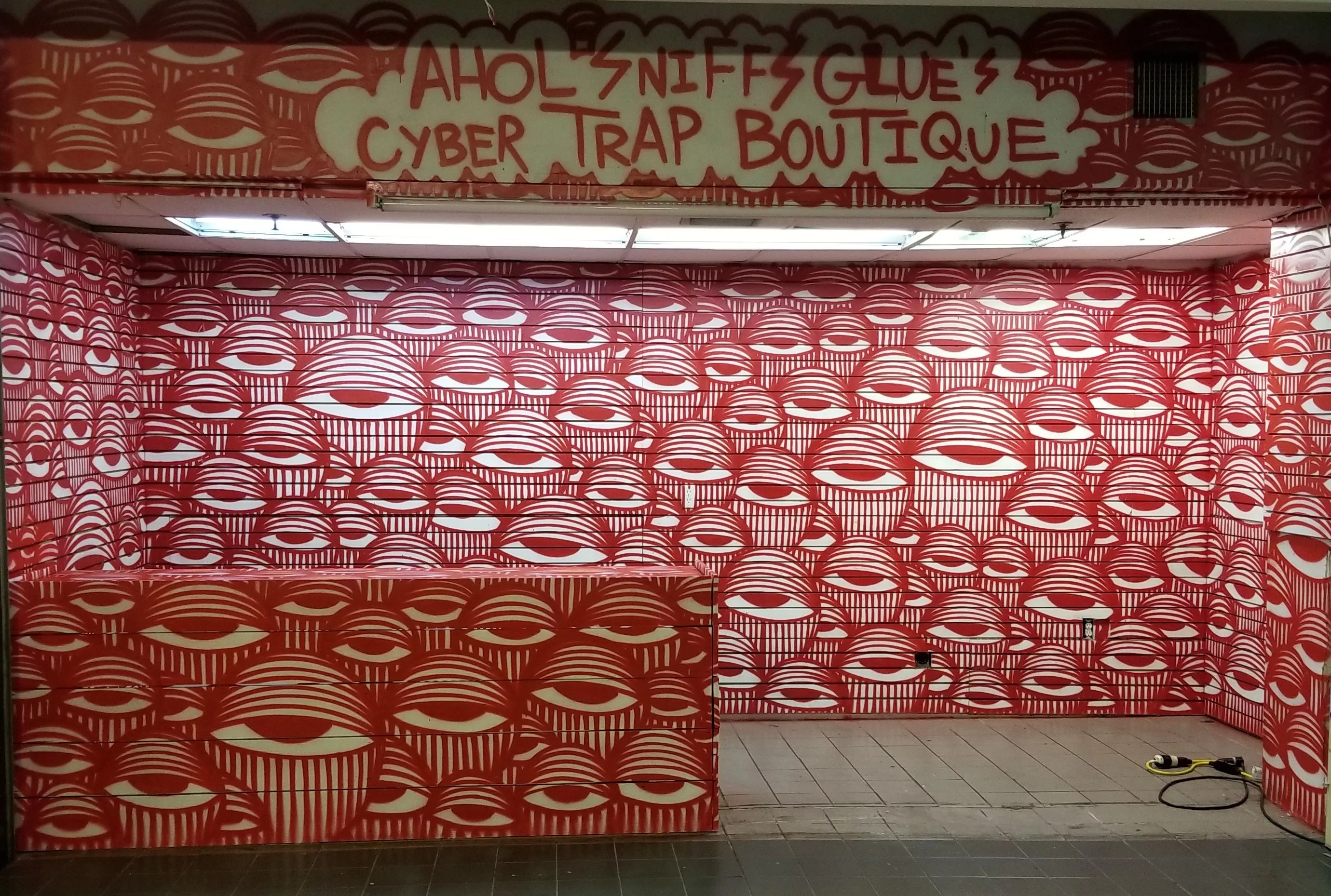 The storefront, nestled in the Flagler Station shopping arcade, is adjacent to a perfume shop and across from a commercial real-estate office that exhibits Ahol’s art. Spray-painted in a blood-red optical illusion of the artist’s signature sleepy eyeballs, the store announces its character, much like the outspoken Ahol.