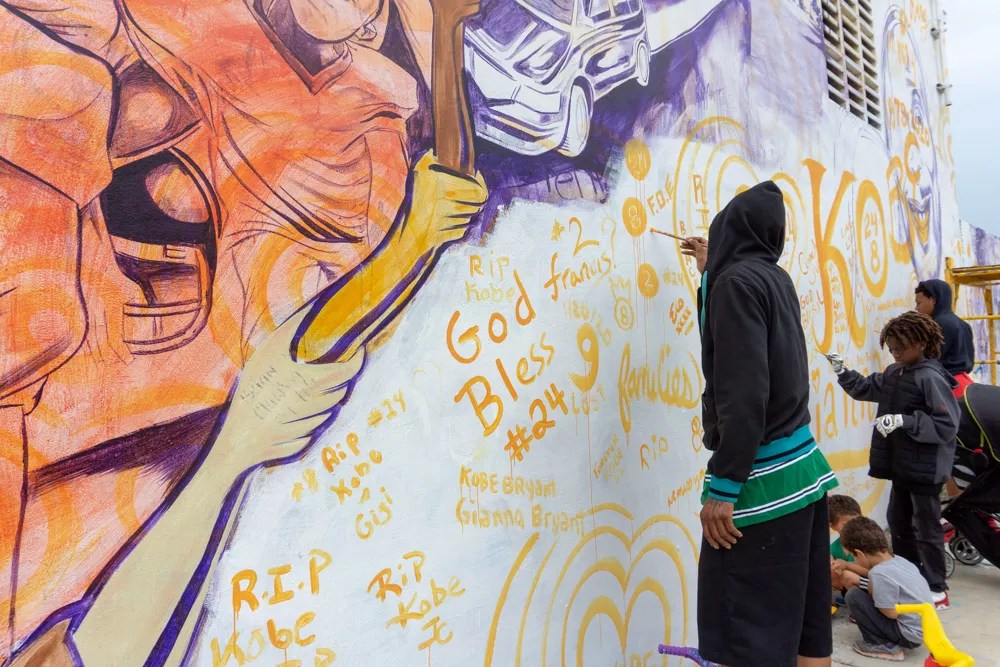 The local community comes out to contribute to the new Kobe Bryant memorial mural in Overtown.