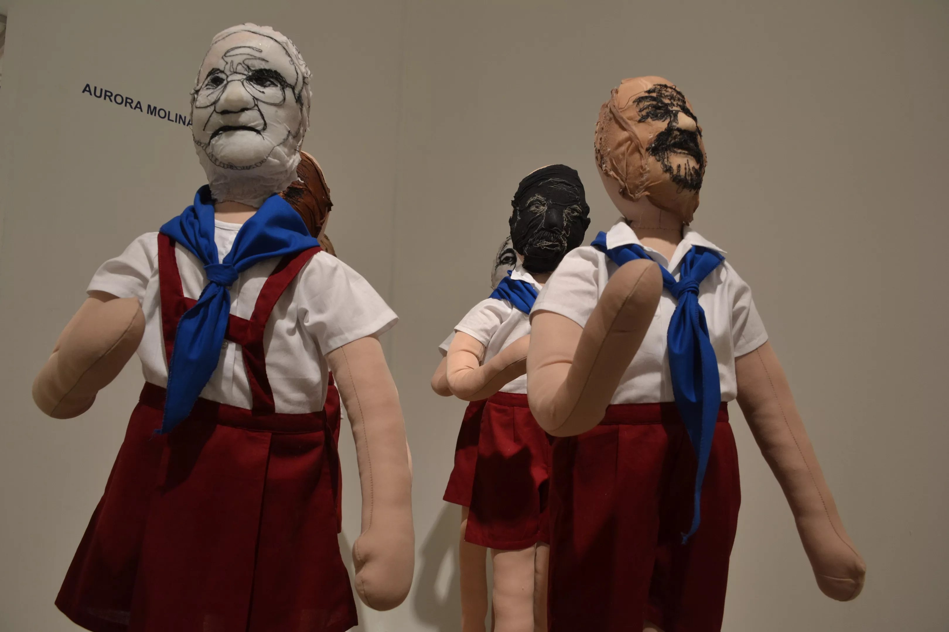 The gallery space flows into a second room, shaped like two mirror images of a right triangle, and features several large-scale works, including a series of embroidered drawings on handmade cotton paper and robotic sculptures titled Pineros, by Aurora Molina. The eerie sculptures, made of fabric and nylon stockings, look like creepy schoolkids with adult faces drawn with childlike imprecision. The robots jerk to life every so often in what looks like a choreographed salute.