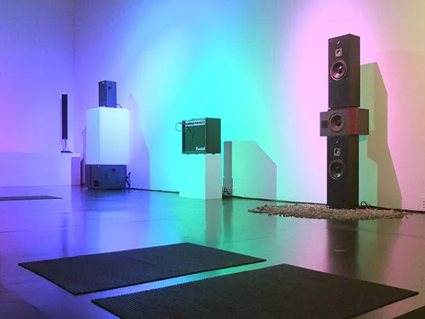 The Ship fuses Eno’s passion for ambient sounds and immersive installations in one sonic sculpture. Mixing audio sources with lights and adornments, the installation envelops the spectator in a wash of aural signals and corresponding visual references. First installed in Sweden in 2015, the work paired the gentle glow of electric candles with monolithic speakers for an effect that was both understated and imposing. The designs vary per location, making for a site-specific spectacle in each incarnation of the work. For the ICA, the piece is just the latest in a long line of collaborations with the music world.