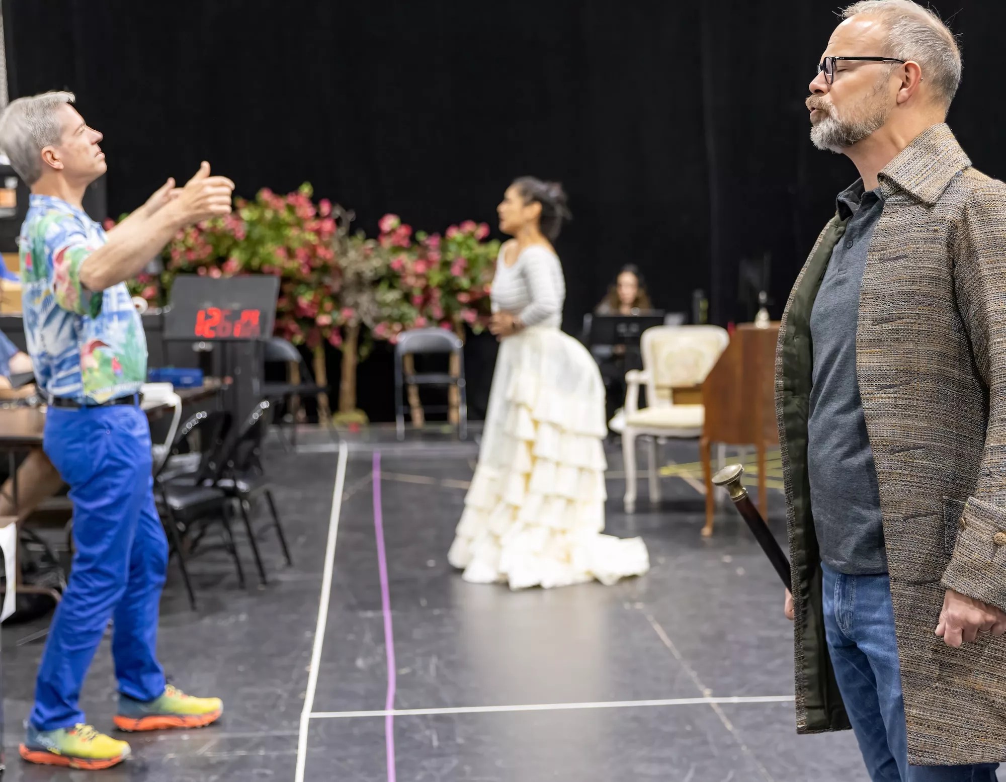 Maestro Joe Illick conducts Cecilia Violetta López and Troy Cook in rehearsal for Florida Grand Opera’s La Traviata.