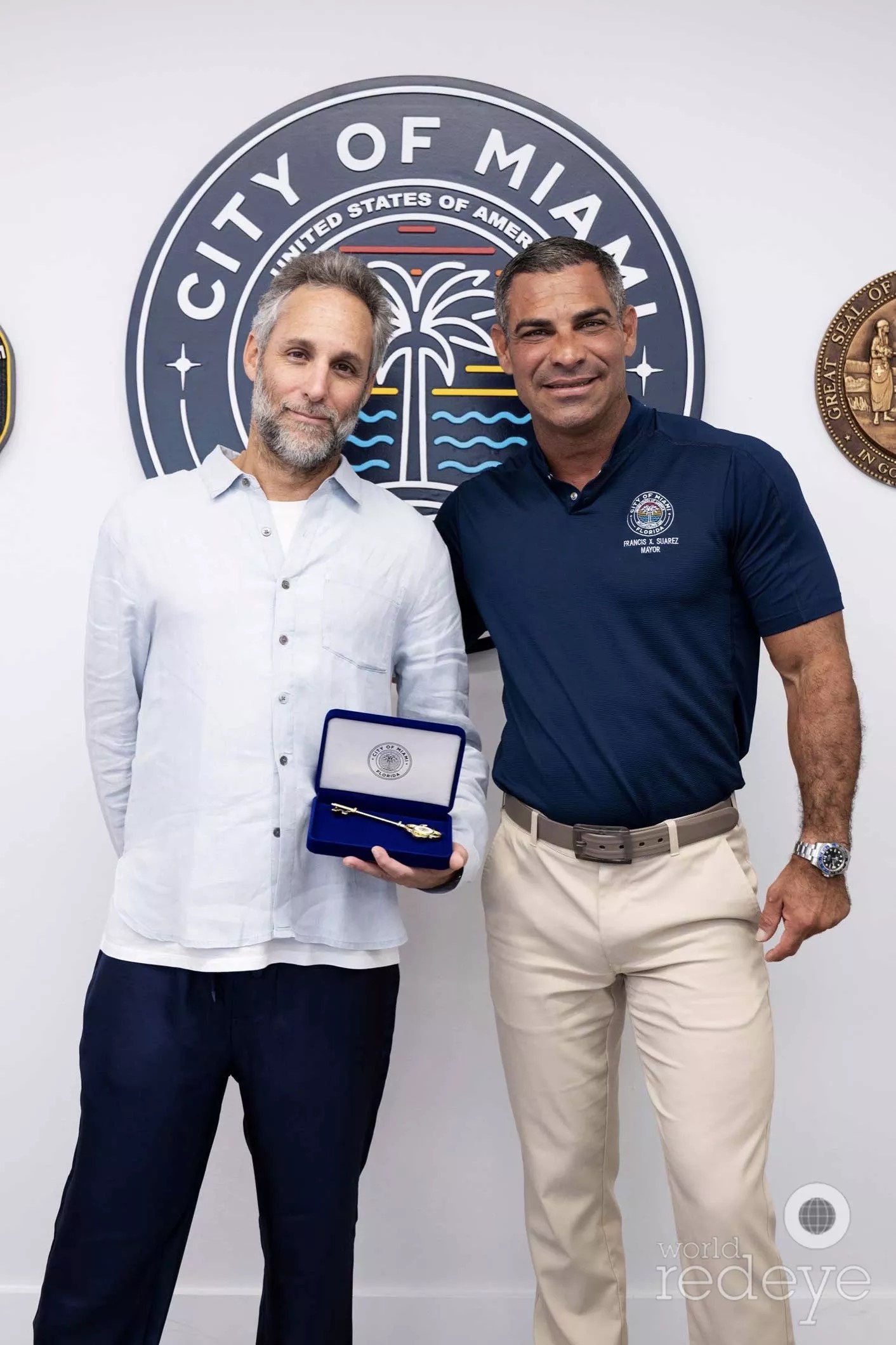Mayor Francis Suarez honored Seth Browarnik, founder and CEO of World Red Eye (WRE), with the Key to the City of Miami in celebration of his more than two decades of capturing pivotal moments in the Magic City.