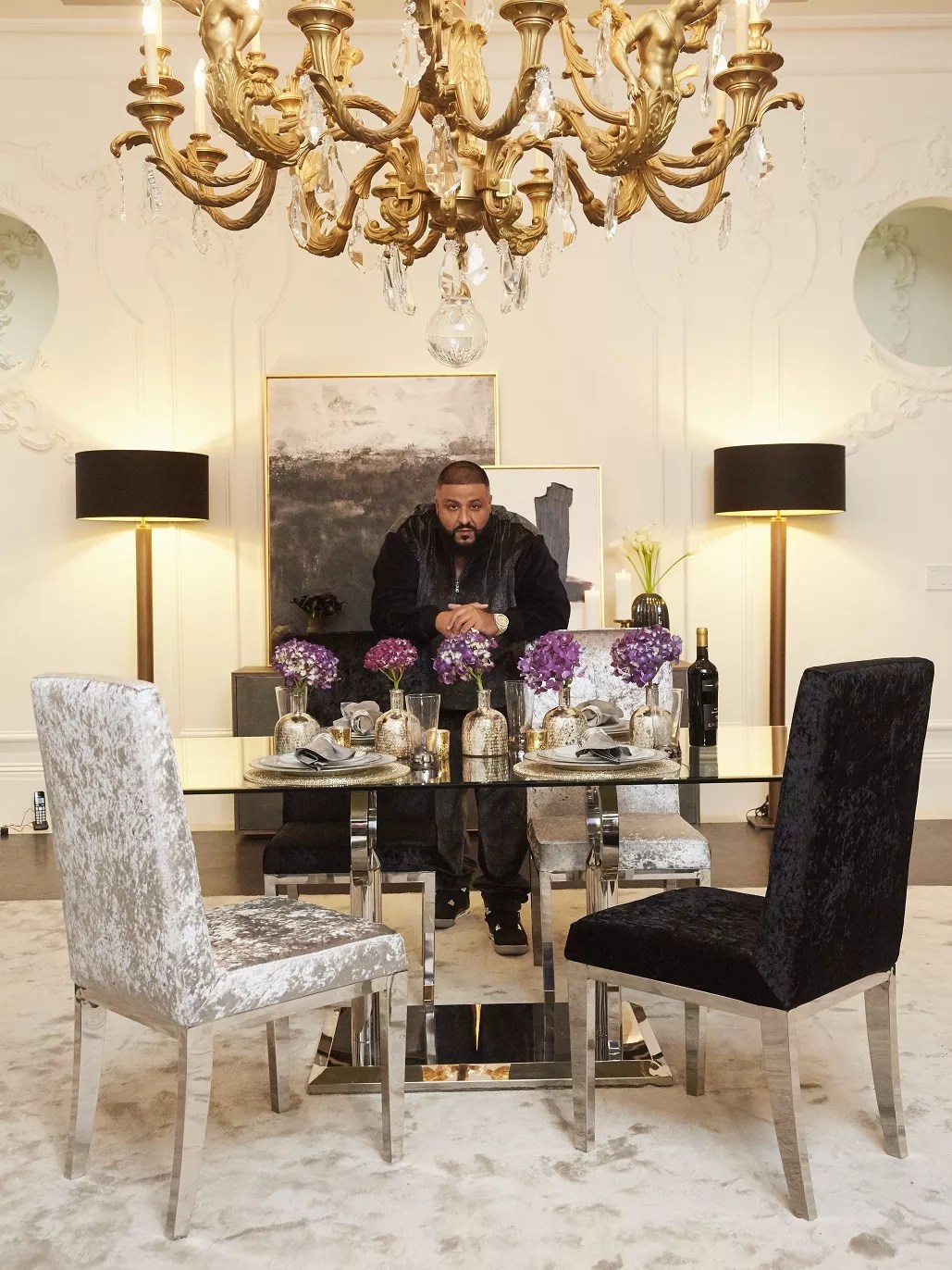 Khaled’s aesthetic also includes a glass dining table flanked by chairs that appear to be made of crushed velvet and mirrors. There’s also a massive golden chandelier with, oh my God, are those chiseled merman torsos? From it hangs a cascading series of crystals, the largest of which looks as big as Khaled’s head.