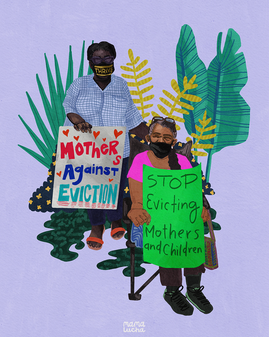 Lizzie Suarez, known professionally as Mama Lucha, is a digital illustrator making politically charged artwork that focuses on issues of climate, rent justice, and the criminal-justice system. In Mama Lucha’s own words, her work “exists to uplift the labor of organizers, and to popularize abolitionist and anti-capitalist ideology.”