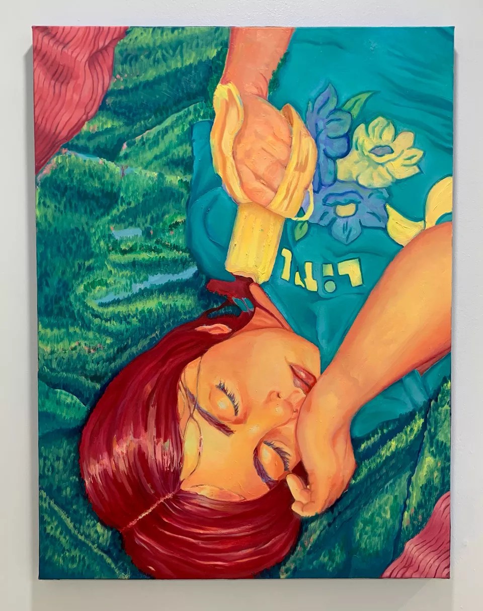 For Alejandra Moros, the power is in the details. A BFA student with a 2021 residency at the Bakehouse Arts Complex under her belt, Moros focuses the gaze of her most recent work almost exclusively on zoomed-in details of bodies in motion. Her oil paintings draw attention to details of hands, ears, watering eyes – highlighting the ways in which touch manifests on the body.