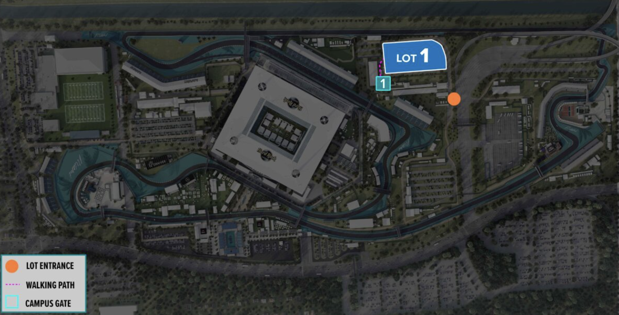 Hard Rock Stadium has provided so many lots for Race Day that each one has its own interactive map. Lot One, shown above, is one of 29 available, including off-site. Shuttles are available from off-site lots to the stadium. Parking opens at 11 a.m. on Friday, May 2; 9:30 a.m. on Saturday, May 3; and 9:30 a.m. on Sunday, May 4.