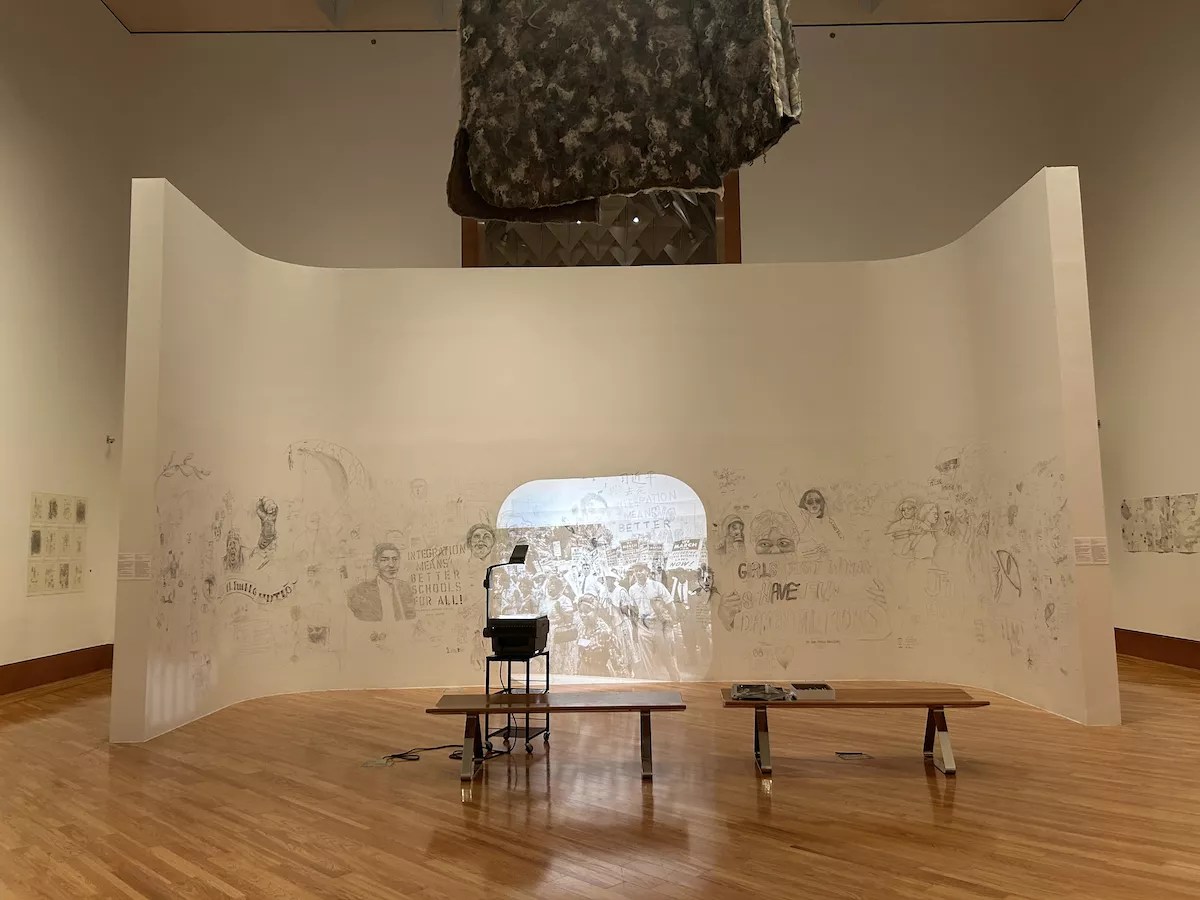 This interactive wall space installed in “Draw: Point to Point” invites the average visitor to trace or sketch protest photography by referencing projected transparencies to spur community engagement.