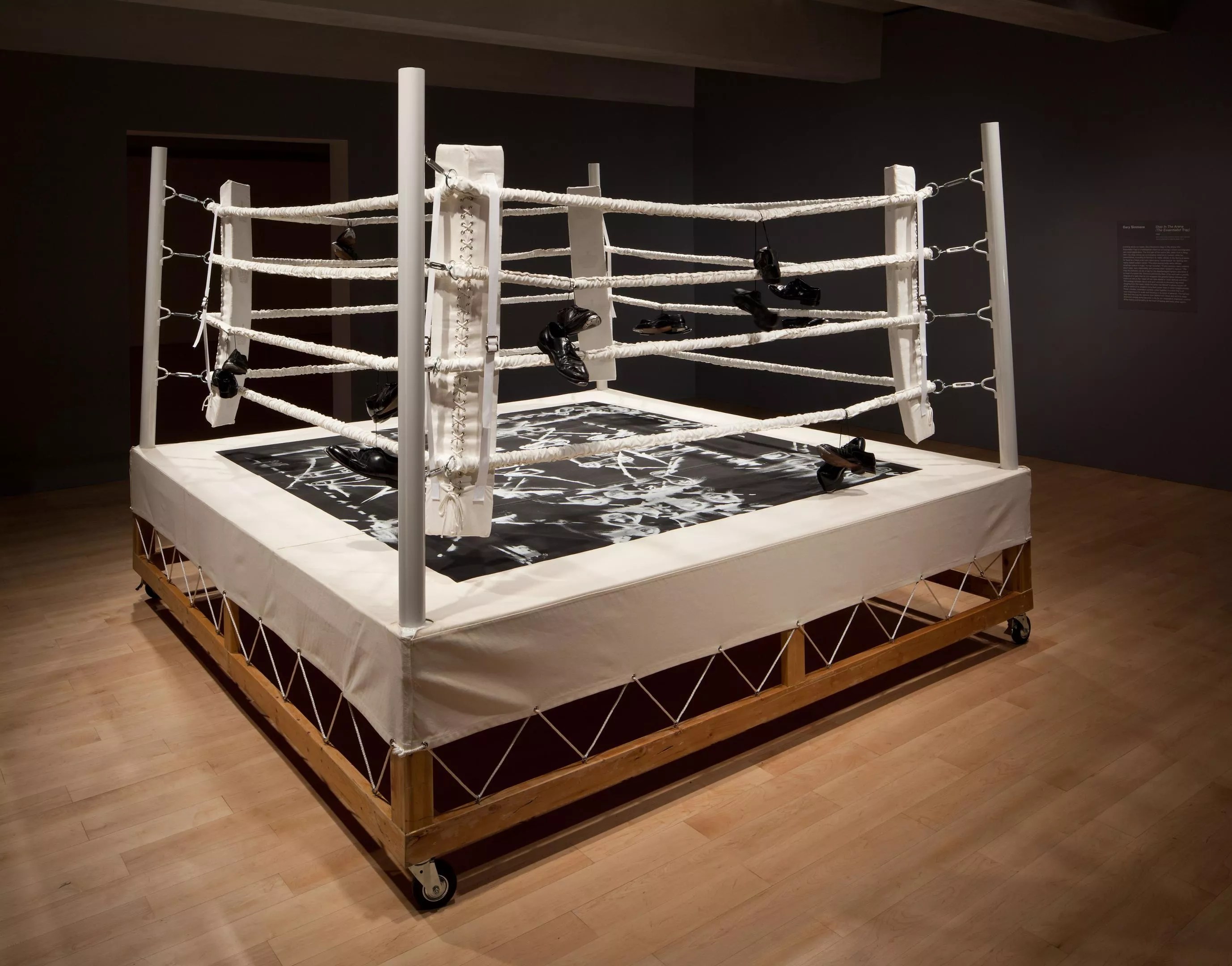 Empty shoes, chalk-smeared blackboards, a boxing ring with steps but no fighters – when looking at artwork by Gary Simmons, it’s best to think about what isn’t there. “Public Enemy,” the New York native’s new show at the Pérez Art Museum Miami, is full of displays where something seems missing, forcing the viewer to ask what should be there and why it isn’t.