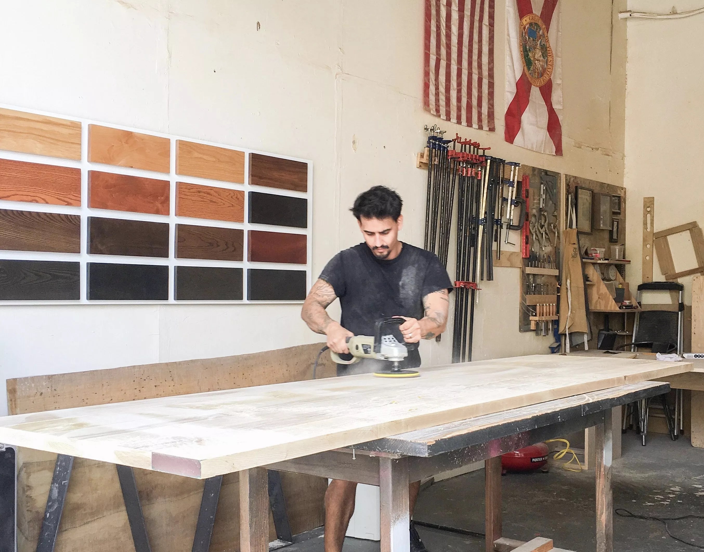 In a warehouse lot in Fort Lauderdale, where each pale pink door looks the same as its neighbor, one space stands out. Its garage door is wide open to expose an intimate studio perfectly arranged for a woodworker. Inside, you’ll find Robert Cortes, the founder, owner, and sole employee of Grove + Anchor – a handcrafted furniture gallery – who’s earned an impressive local following, particularly on social media.