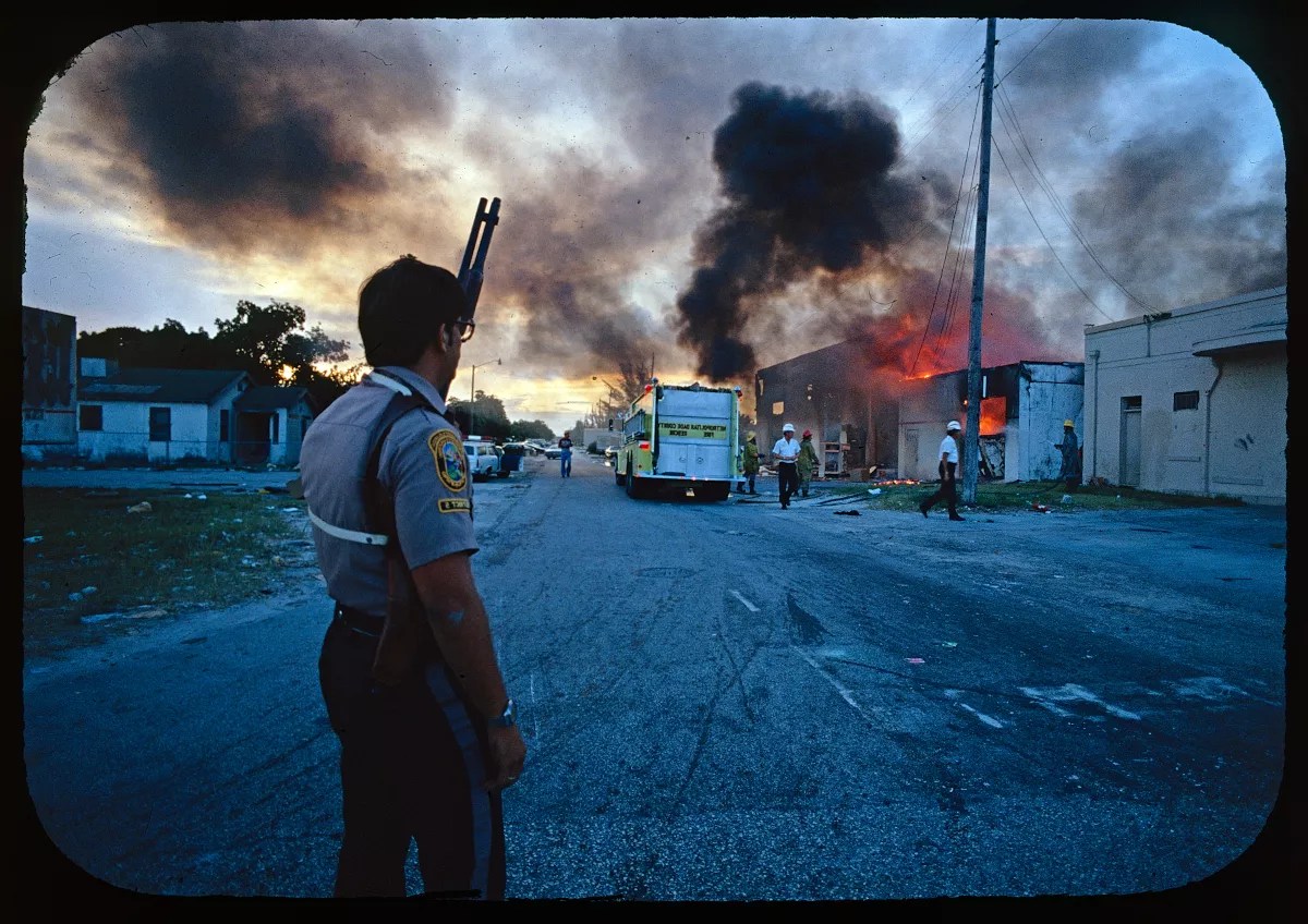 Street scene of burning building with police and firefighter responders during the McDuffie Riots, 1980. Liberty City.