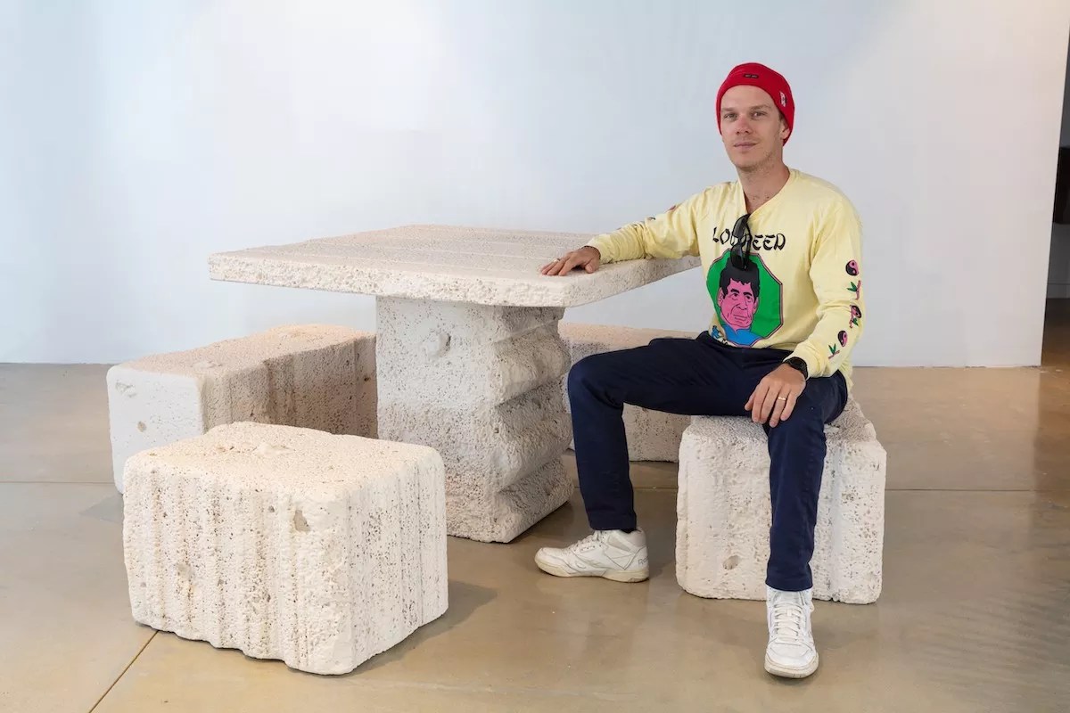 “I’ve always liked these places where young people go to hang out [in secret], like rock quarries or caves or back alleys or abandoned buildings,” Moore says. “Since I developed this method of making my own coral rock, I thought it would be cool to reference those kinds of places while also making functional objects out of faux coral.”