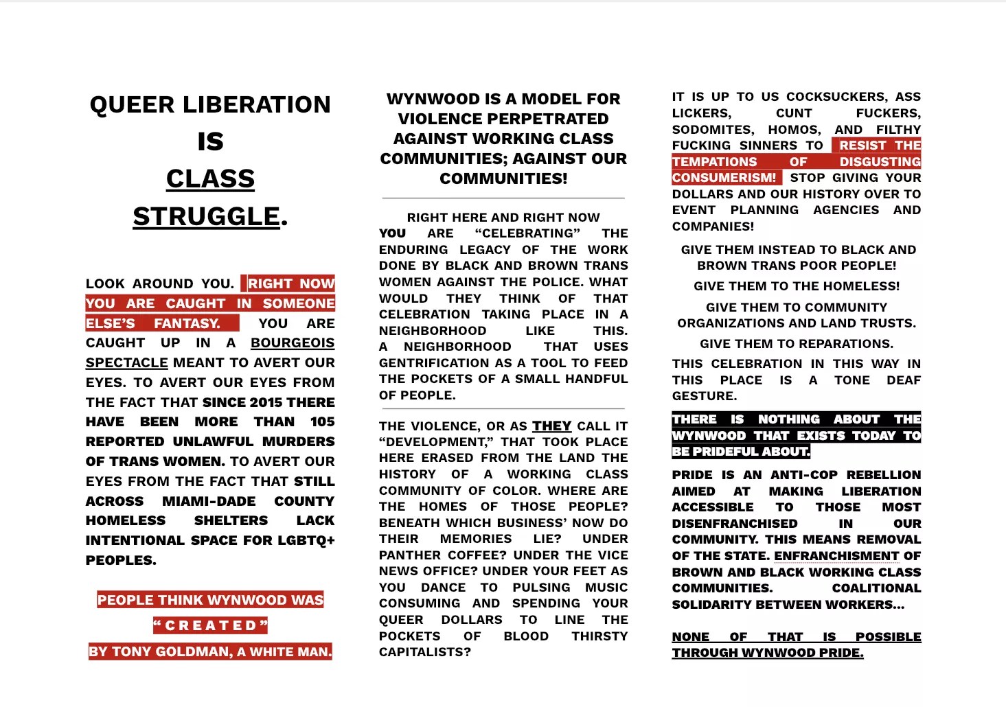 Within the broader context of land and labor here in the city of Miami, Wynwood has come to represent the ideal business frame for gentrification and erasure. No longer is Wynwood a working-class community constituted by a diverse group of Puerto Rican, Cuban, and Haitian peoples. It has been flattened and hegemonized into a model for the gentrification of working-class communities of color vanguarded by “art and culture” to line the pockets of big-money developers in this city. If Pride is by a community and for a community, what community is Wynwood Pride for? The wealthy, white bourgeois class of the gay and lesbian community.