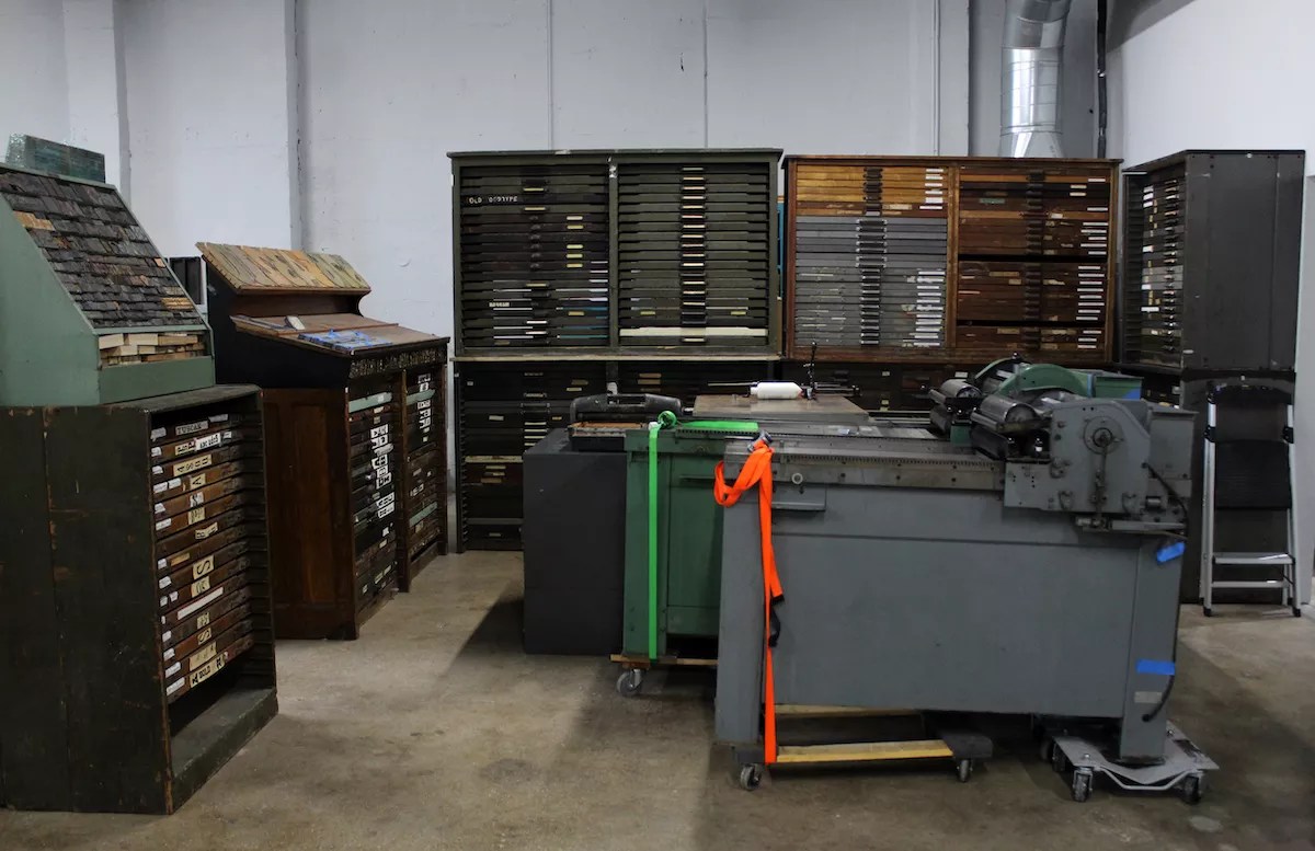 The letterpress room is separated by IS Project’s massive collection of antique lead and wood types housed in antique type cabinets.