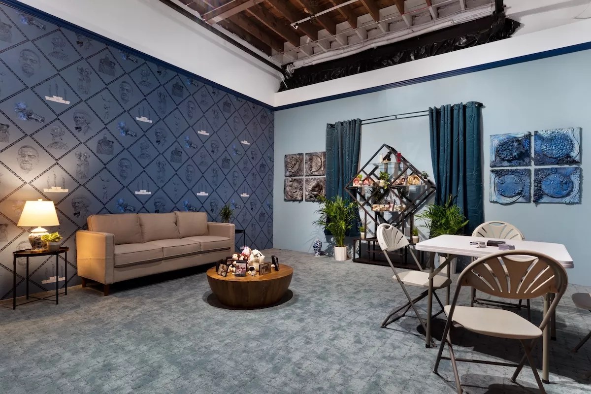 It’s that “culture of yes,” as Mertes calls it, that encouraged T. Eliott Mansa to build his “Room for the living/Room for the dead,” the second of two site-specific installations currently on view at Locust. Mansa’s piece attempts to reconcile a division common in African American homes between formal living rooms full of artifacts and heirlooms and family rooms where people gather. Shelves are adorned with family photos and books on Black history and art, and the blue wallpaper is covered with images of Malcolm X and Frederick Douglass.