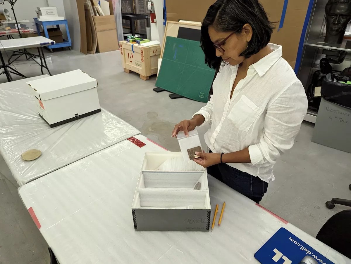 Silvia Manrique handles a box from a recent museum acquisition of over 1,300 medallions.