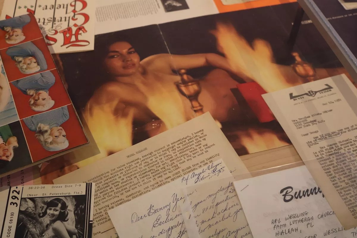 The vitrine includes model-release paperwork, original magazine centerfolds, and letters. In one correspondence, she describes a 17-year-old’s father being present during her test shoot.