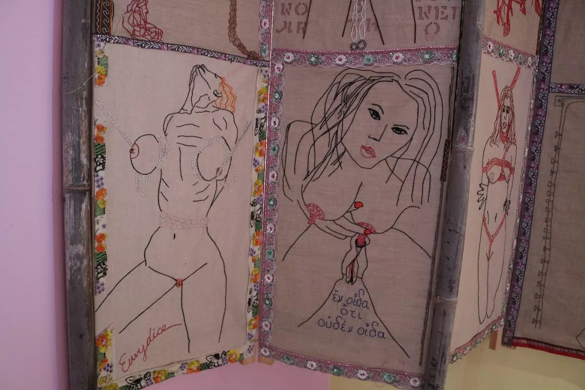 On her 84-by-64-inch folding, self-standing screen, she uses hand-stitched embroidery to depict the naked female body in bondage and masturbating. Though screens are generally used to hide the nude figure, here Eurydice turns that tradition on its head by placing the naked body and its pleasure front and center.