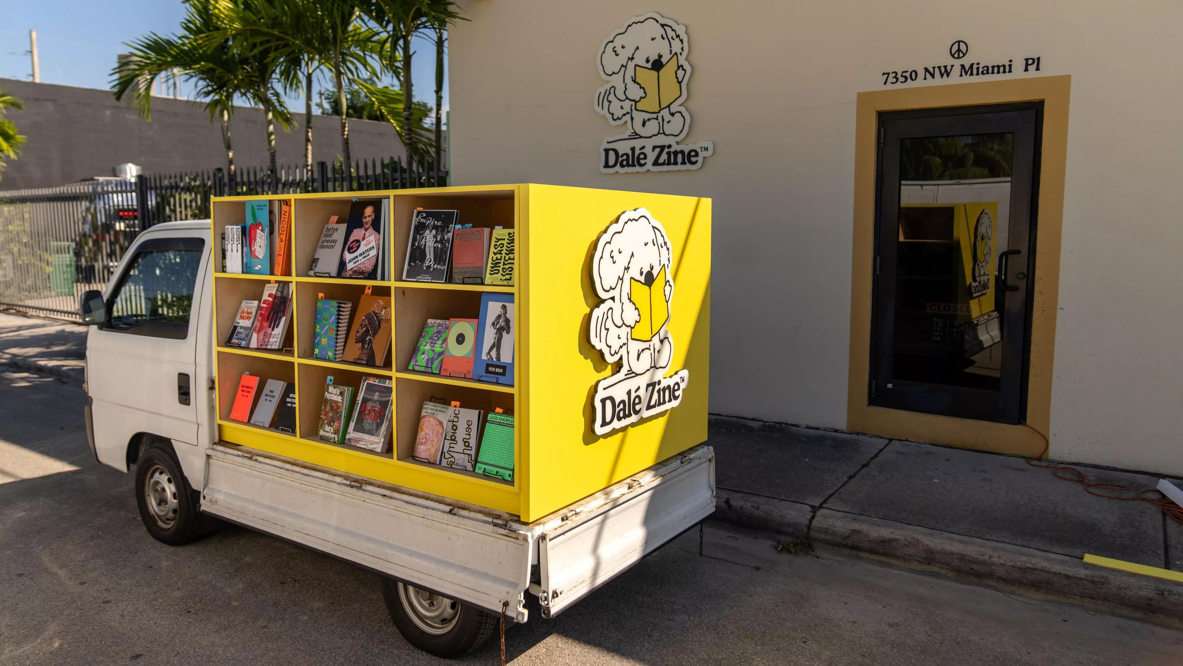 This isn’t just any standard bookmobile, however. The shop, which New Times declared the Best Bookstore in Miami earlier this year, is using a converted mini-truck from Japan to house the Mobile Dále Zine Shop. Co-owner Steve Saiz purchased a 1996 Honda Acty, part of a special class of vehicles called kei trucks, and fitted it with a bright yellow display shelf built by local carpentry business Koki Customs.