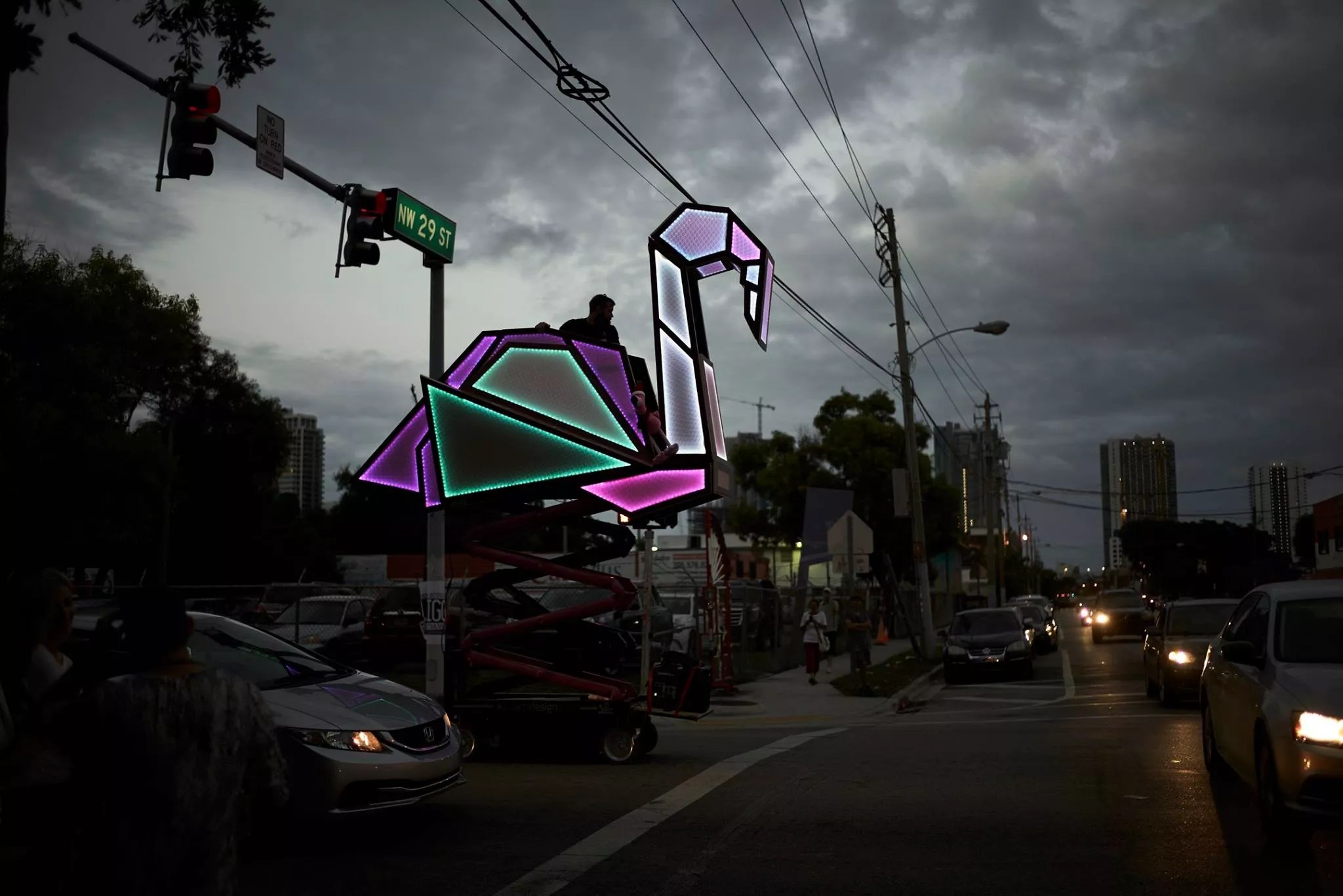 Miami Design Shop’s signature flamingo makes its way through the city streets to wow passersby.