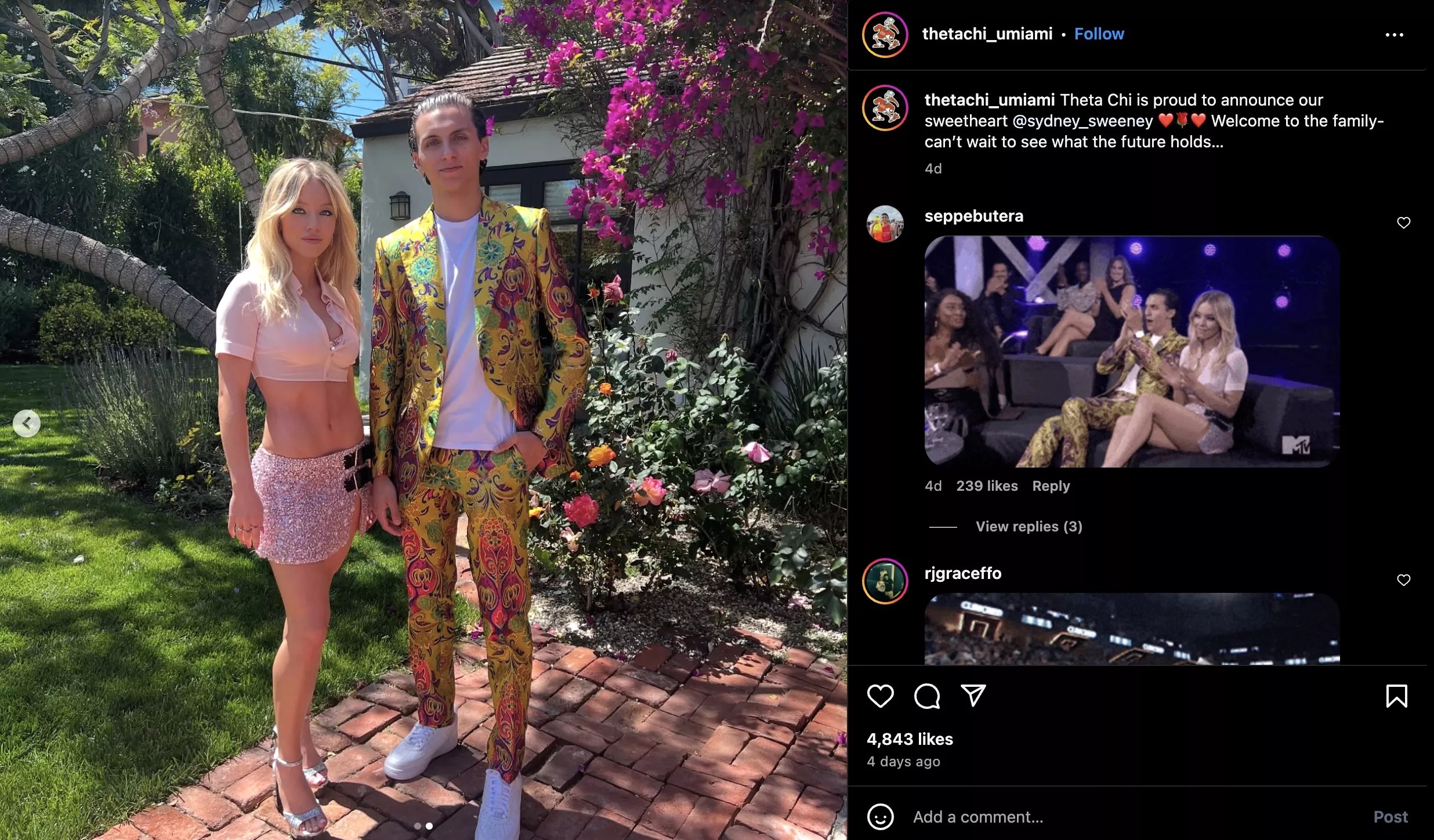 “Theta Chi is proud to announce our sweetheart @sydney-sweeney â¤ï¸ðŸŒ¹â¤ï¸,” the post reads. “Welcome to the family – can’t wait to see what the future holds…”