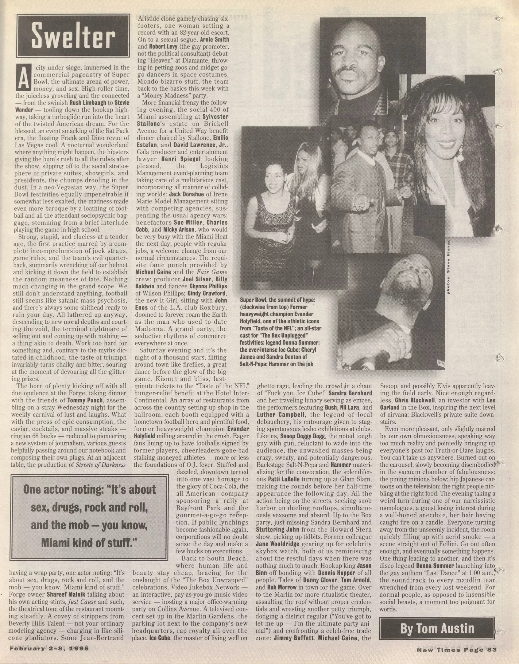 Behold “Navel Maneuvers: A fat guy who swam in Jell-O, a Grand Canyon of female cleavage, and enough Wesson oil for a fried-chicken cookoff. We watched it all so you wouldn’t have to.” Indeed, the subject matter provided prime red meat for a New Times reporter’s keyboard cleaver, in that tickets for a Super Bowl cruise billed as “Hedonism on the High Seas” went for $350 to $2,000. Among the advertised enticements: 200 naked showgirls and dozens of pro football superstars, nude massages, hot coed bubble baths, nude limbo contests, and the opportunity to frolic with girls in a Jell-O-filled pool. Better still, the cruise was the brainchild of Michael J. Peter, the proprietor of a “network of nudie bars strung like prurient pearls around the world” who was also under federal indictment for threatening competitors he believed were trying to recruit his dancers, skimming profits, and withholding taxes from one of his clubs to pay off members of the Mafia.