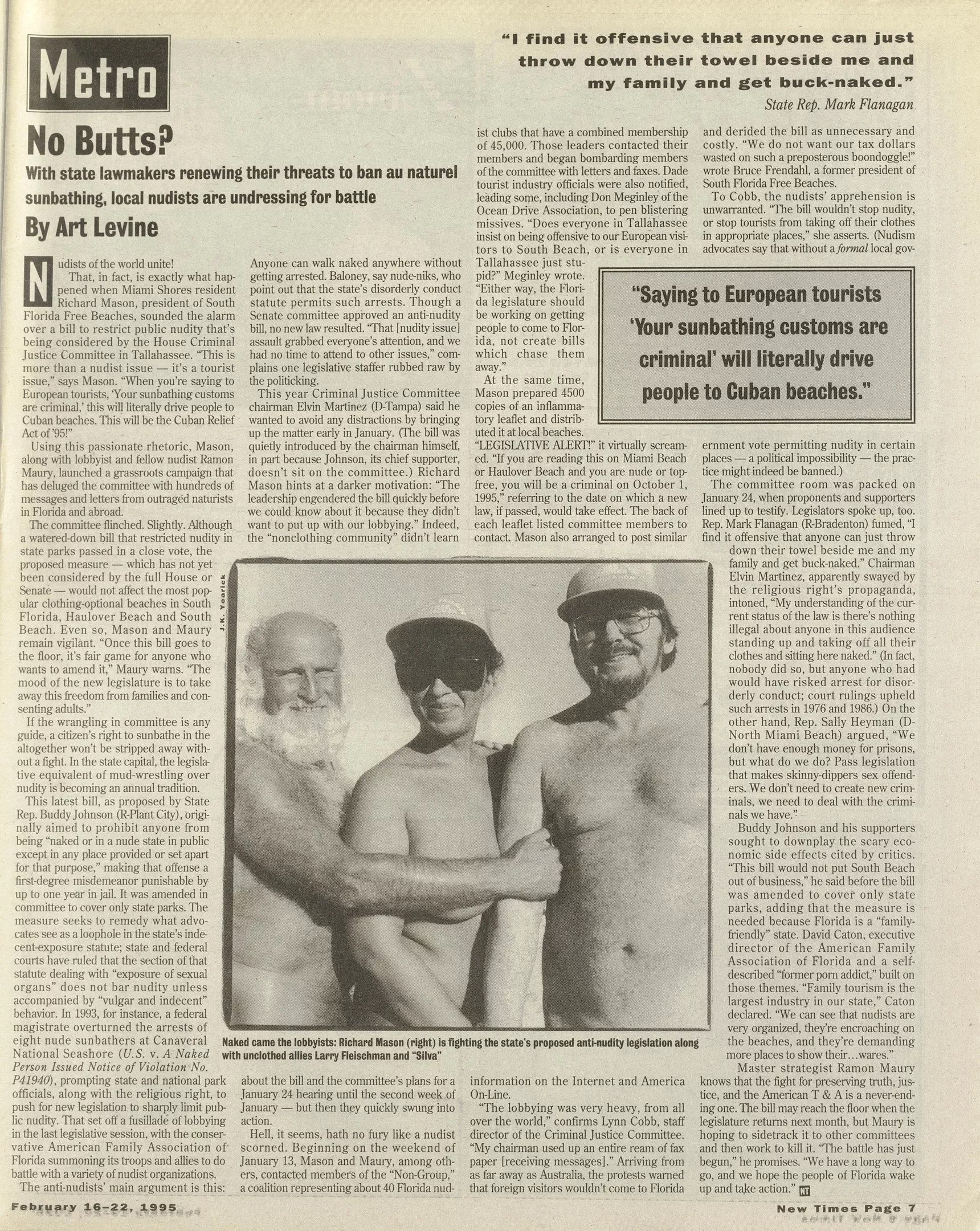 Also from the Metro section, “No Butts” was an…exposé by Art Levine, the paper’s associate editor at the time. Most locals were (and still are) familiar with the European etiquette observed on South Beach and the famed clothing-optional stretch of Haulover Beach. But the 1980s and ’90s saw periodic challenges to the naturist lifestyle, and the naturists weren’t having it.