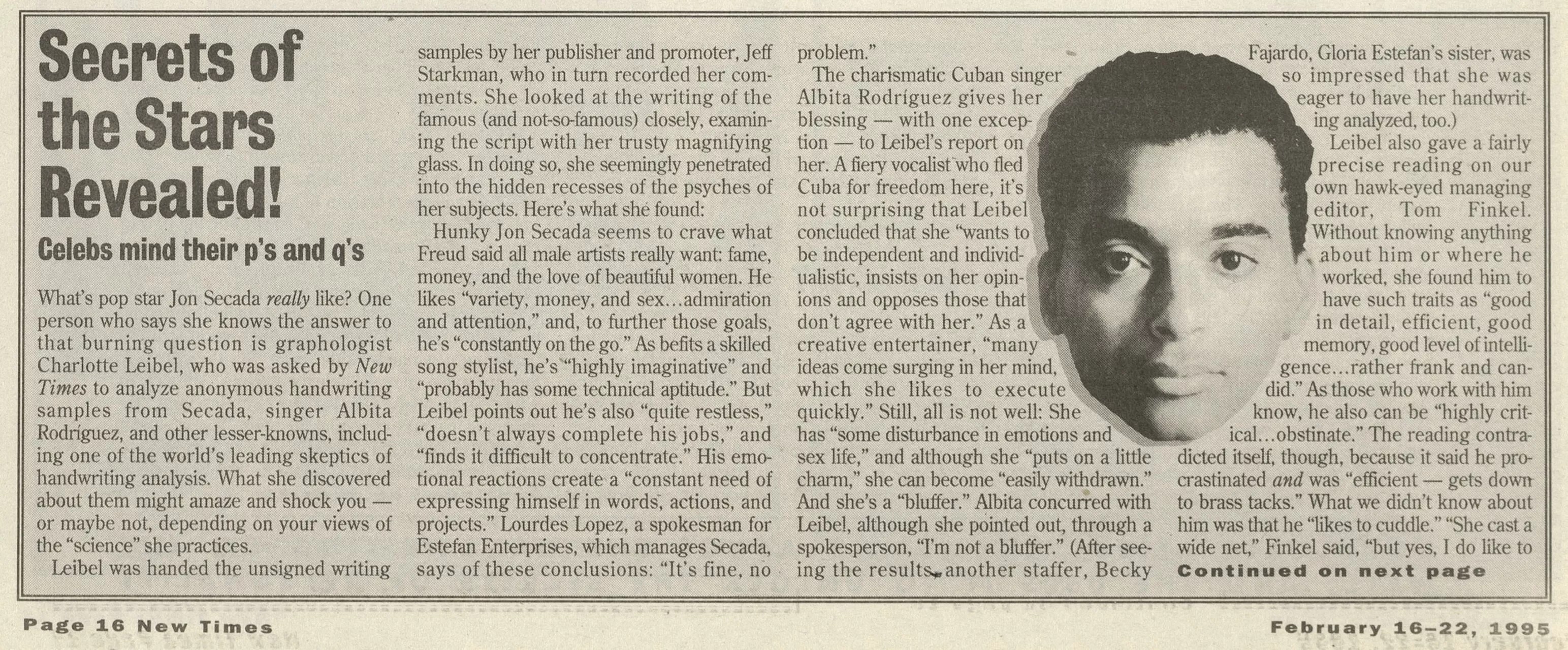The same issue included “Writes of Passage,” a profile by Levine about 95-year-old Charlotte Leibel, a Miami Beach resident and longtime handwriting analyst. Leibel, who’d authored a book two decades earlier called Change Your Handwriting…Change Your Life, had recently been featured on network TV shows, where she parsed the handwriting in O.J. Simpson’s infamous “suicide note.”“During Leibel’s segment on Hard Copy, the TV announcer breathlessly intoned, ‘Now one of America’s leading handwriting experts has just finished examining the note, and what she has to say may shock some of O.J. Simpson’s supporters,'” Levine imparts. “From her couch in her apartment in a public housing project on Alton Road, Leibel told the TV interviewer, ‘When I saw his writing, I was pretty well convinced that he was capable of violence.'”