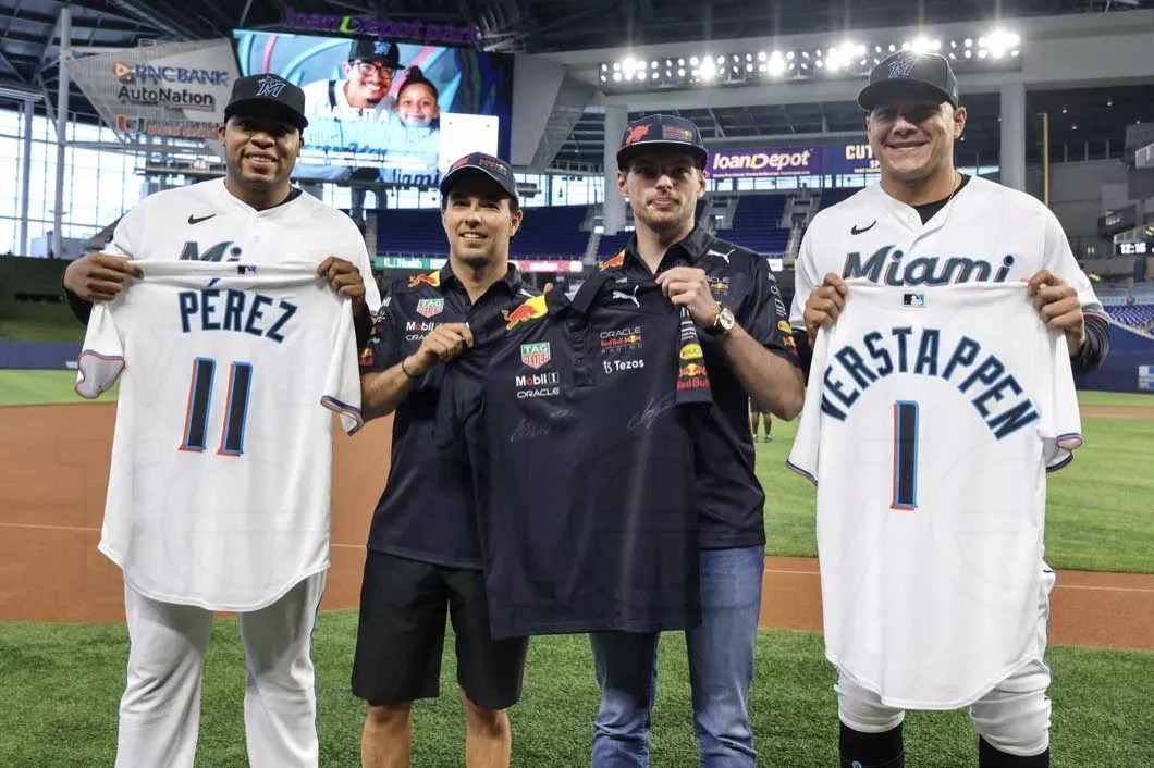 From pit lane to the pitching mound, Oracle Red Bull Racing drivers Max Verstappen and Sergio Pérez threw the ceremonial first pitch before the Miami Marlins game on Wednesday, May 4, at Loandepot Park. World Red Eye