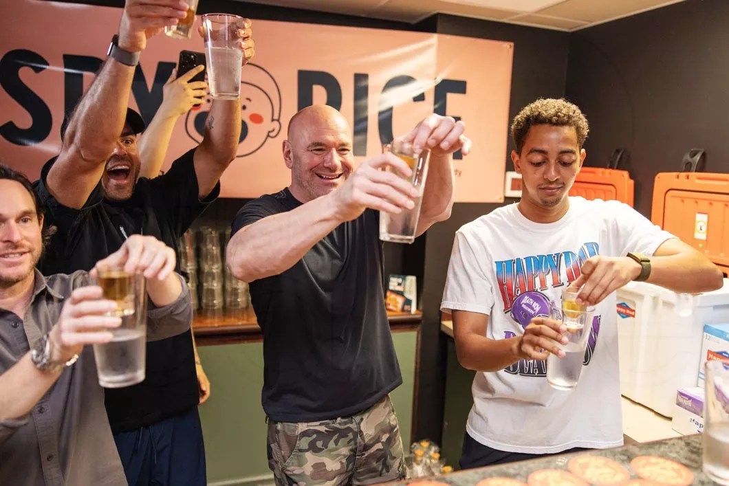 Dana White joined the Nelk Boys to kick off spring break with a pop-up featuring Krispy Rice and the Happy Dad x Howler Head Whiskey Bomb ahead of UFC 299.