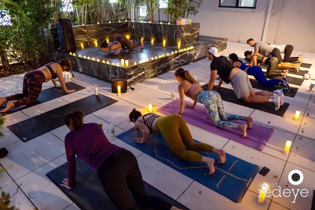 Yoga lovers flowed with Annie through a 45-minute dynamic flow in one of Design District’s most coveted event spaces, the Garden Rooftop. This restorative candlelit flow focused on lots of conscious breathing and conscious movement helping guests return to their present and release any lasting anxiety from the week. Sofia Perez, Opheli Avrg, and Ulira Malle World Red Eye