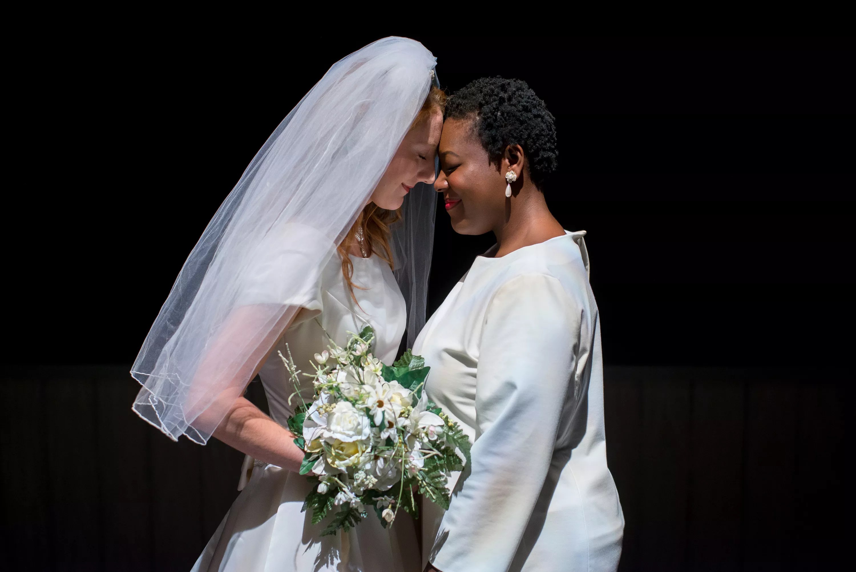 Brides Jen (Lexi Langs, left) and Macy (Stephon Duncan) share a tender moment on their wedding day.