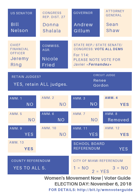People of Miami: Are you ready and willing to do the same? Women’s Movement Now, a progressive organization comprised of a grassroots group of females in their 20s and 30s who support each other’s career growth, activism, civic engagement, and curiosity, has put together an exceptionally handy voter guide to make your experience at the polls seamless.