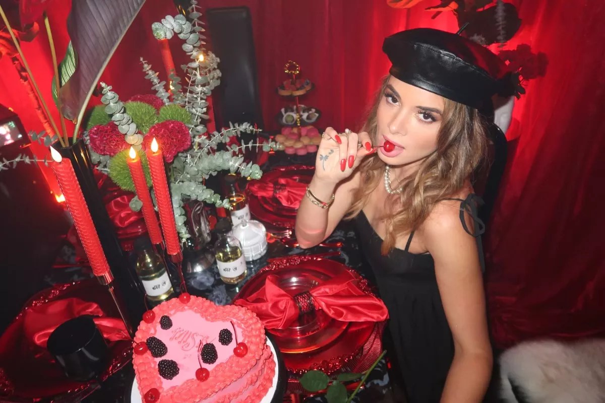 She finds herself at Floyd for the venue’s monthly party series, My Friend Misty, where she’s been tapped as the creative director. Gessa uses each party to design a tableau of the fictitious Misty’s home. “Tonight is a dinner party. It’s like you just walked in and just missed Misty,” she adds. Dreamy red velvet drapes the room. Small TVs play movies, and neon signs display arrows piercing a heart. Paintings adorn the walls, and a dinner table is set with golden dinnerware, platters of macron and chocolate-dipped strawberries, and a whole cake with “Misty” iced in frosting.