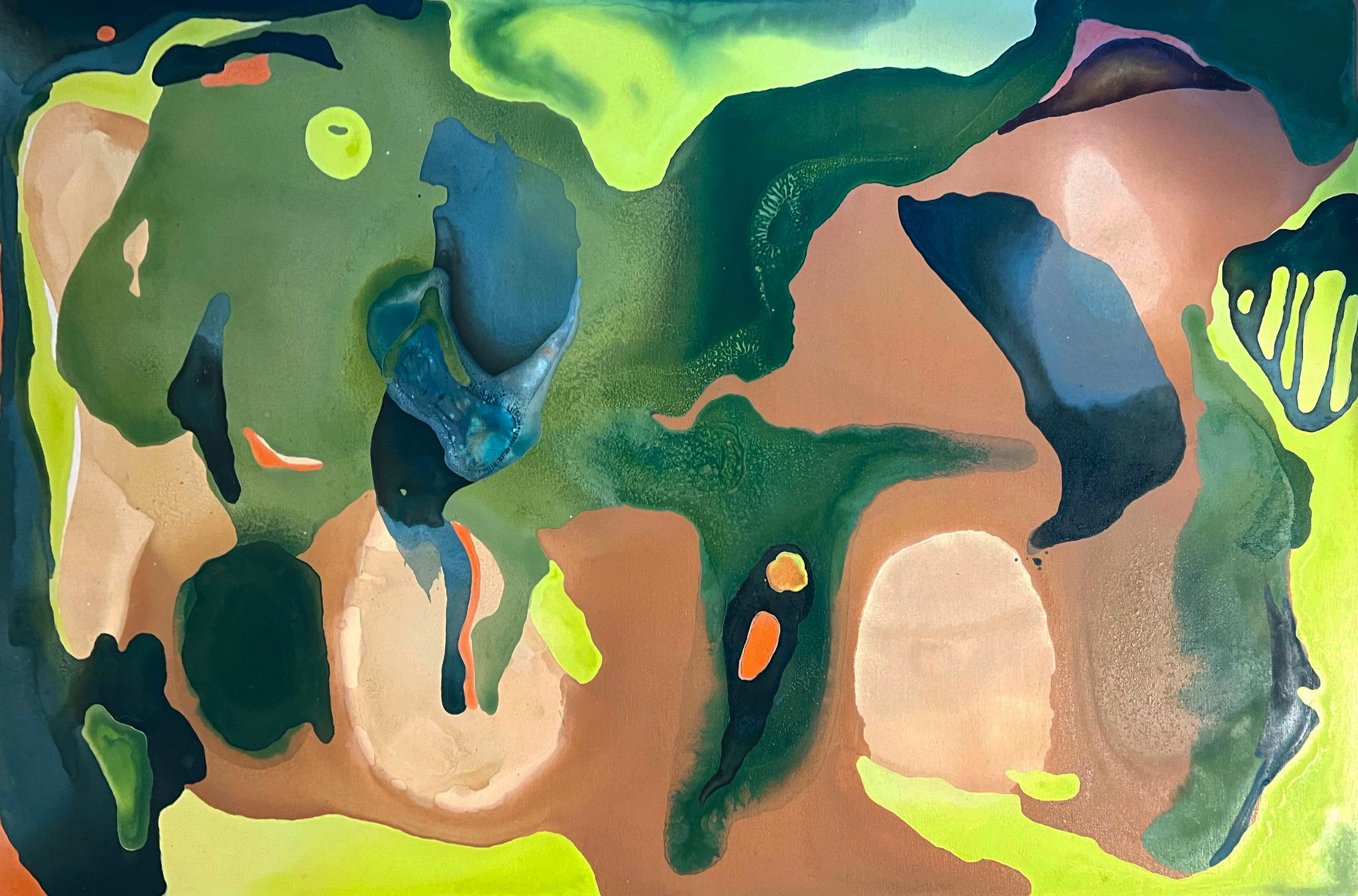 “I take a lot of my inspiration from plants and nature, and I also go back to my Venezuelan roots, which isare very colorful and tropical,” she explains. This explains her connection to color. She is very cognizant of color theory and spends time mixing her own paints to try and control the shades as much as possible.”[Making art] is just so soothing to me. It keeps me grounded,” she adds, adjusting her soft, peach-colored glasses frames and revealing a rose-gold snake ring writhing on her index finger.