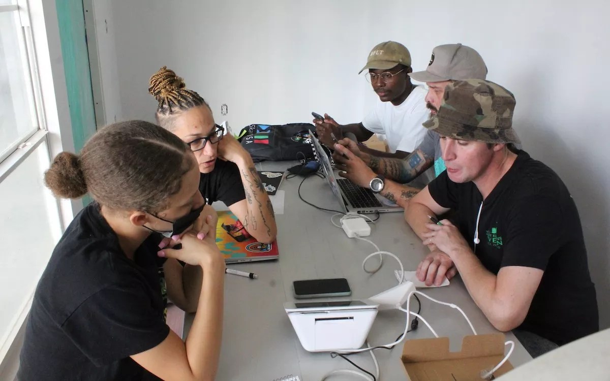 The SkateBird Miami team takes a business call in preparation for opening day.