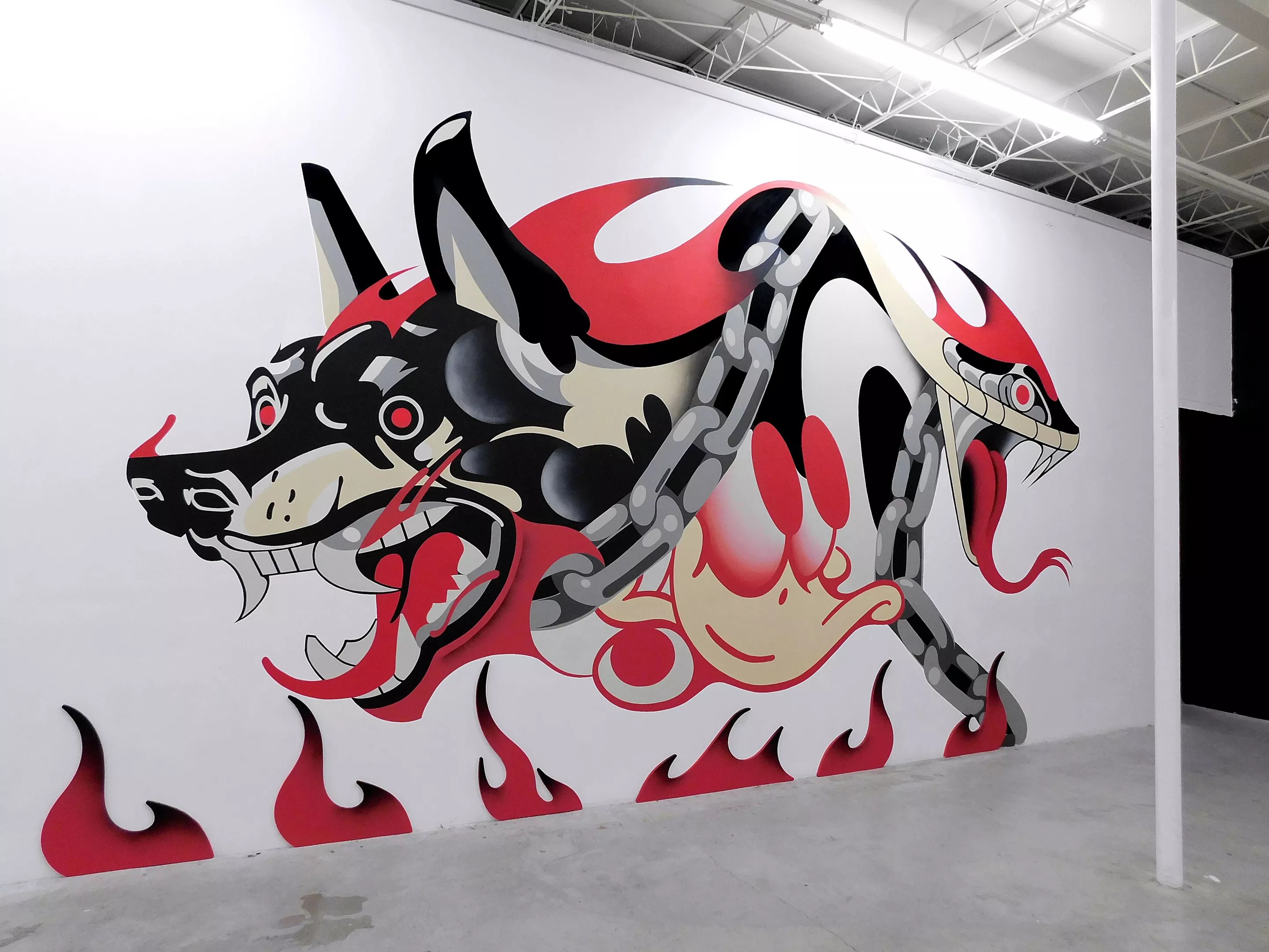 Now 31 years old, Hall is ready to introduce Baghead to Miami audiences properly via his debut solo exhibition in his hometown. Opening at Superchief Gallery Miami in Wynwood this Saturday, November 9, “Shadowplay” will display Hall’s art, which is heavy on animal imagery – particularly ducks, dogs, and snakes – and light on canvases. He says he “can’t stand” painting on canvas and will show only one piece in that medium at the exhibition.