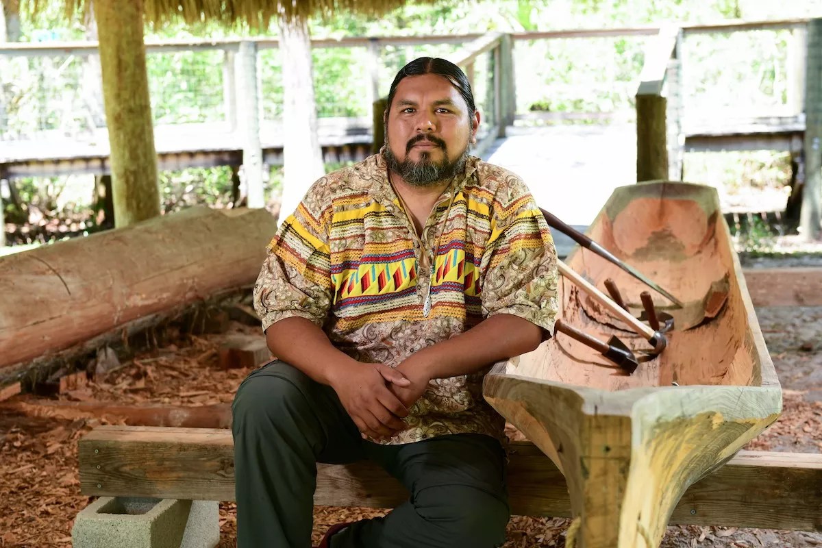 When Seminole artist and master canoe carver Pedro Zepeda begins a project, he starts by finding just the right tree. Traditionally, a dugout canoe is made from a single cypress log. Walking around Big Cypress Seminole Reservation, Zepeda typically looks for larger logs that have already fallen or died of natural causes. Thanks to logging in the first half of the 20th Century, old-growth cypress are rare. If the tree is too big to pull out of the woods, sometimes he’ll work on it right there in the forest until it’s light enough to move; otherwise, he’ll get someone to help him transport it to his workspace.