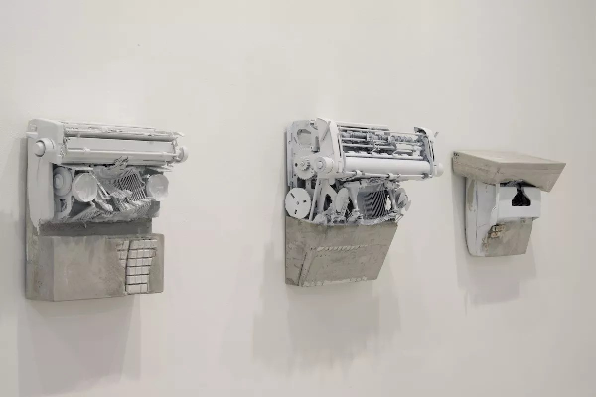 A row of typewriters hangs on the wall like so many payphones, their ribbon spools emptied and painted white, their keys swallowed by concrete, the strikers used to press the ink to the page rendered relics of the past. Viewing these objects is an experience akin to discovering an ancient technology utilized by a civilization that no longer inhabits the Earth.