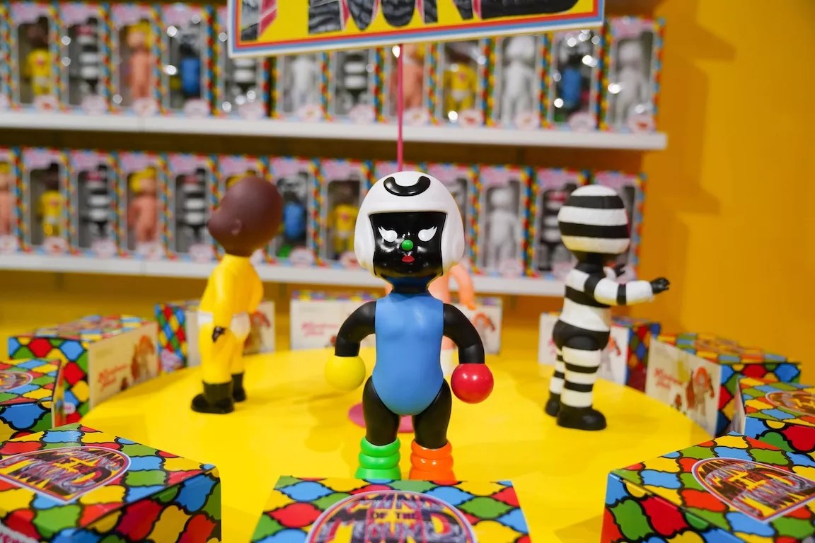 The entryway into the alternative art space now resembles a fully stocked toy store, offering Hancock’s branded “Moundverse Infants” action figures, meticulously displayed. A brightly colored quatrefoil pattern animates the packaging and provides a floor pattern that leads back to the main gallery. A touchstone that recurs across mediums in Hancock’s work, the quatrefoil reflects the pattern on his grandmother’s linoleum floor, representing “home.”