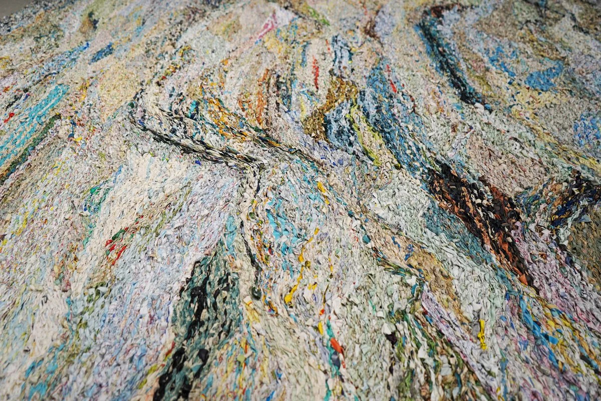 Every abundant offering has a story behind it. The landline telephones all belonged to the late father of one of Phillips’ friends (who found a phone in every room of his home after he died). The tapestries that hang throughout the space are made from carpets cut and pasted together to create group portraits. There’s even a piece that Phillips has kept rolled up in a corner, unsure of whether to include it in the show. She unrolls the item, a collaborative work with artist Mary Babcock, which is made entirely of roadmaps woven together into a massive ridged collage of colors and cartographical elements. The maps, collected from friends and friends of friends, were found in a warehouse, having seemingly been abandoned.