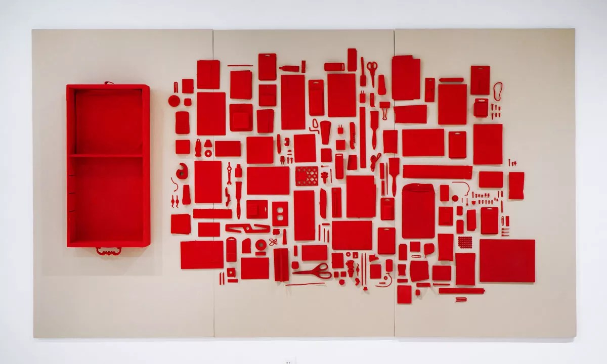 The careless nature of junk itself takes on a new meaning in a wall display of red spray-painted items that Phillips has laid flat and flocked – “flocking” being a process in which millions of synthetic or natural fibers are attached to a surface.