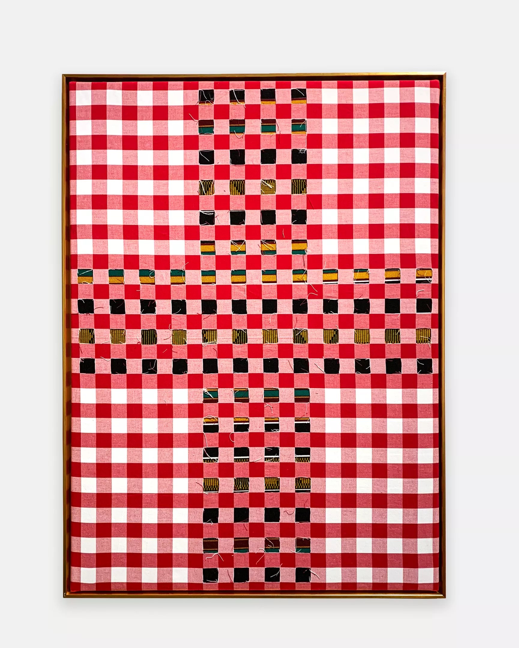“Once I realized that gingham was a derivative of something that was made in the cotton industry [and] was used as uniforms for slaves on the plantations, I started to immediately take out the white squares and put the material back together,” Massey explains. “I eliminated the white squares as a stand-in for colonialism. Not only slaves were affected, but child labor was involved. It wasn’t until I started to look at the historical figures or images wearing the gingham that I realized I had to put the figures into the work.”