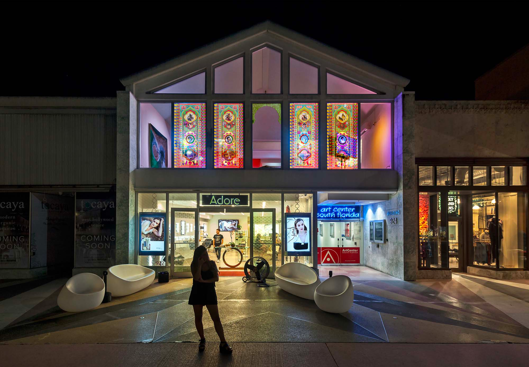 One dominant dialogue happening in the resulting exhibition, titled “On the Road II,” is about mobility. One of artist Osman Kahn’s works for the show is made of large vinyl sheets mimicking stained-glass windows hanging over Lincoln Road. The audience of South Beach’s pedestrian mall is drawn into the show through work inspired by the decorative patterns Pakistani truck drivers use to adorn the sides of their vehicles. Notions of upward mobility and the American Dream are explored in Farley Aguilar’s paintings, in which hauntingly abstracted figures stare out from the canvas. In Ernesto Oroza and Gean Moreno’s Efficiency, viewers can contemplate the architectural and cultural implications of the in-laws’ quarters, once the realm of abuelitos and now the stuff of Airbnb rentals. And in Pat Phillips’ Urban Beach Week/Rump Shaker, spectators can question the historically entrenched structures that make the mobility of black and brown people difficult at best, but most often dangerous.