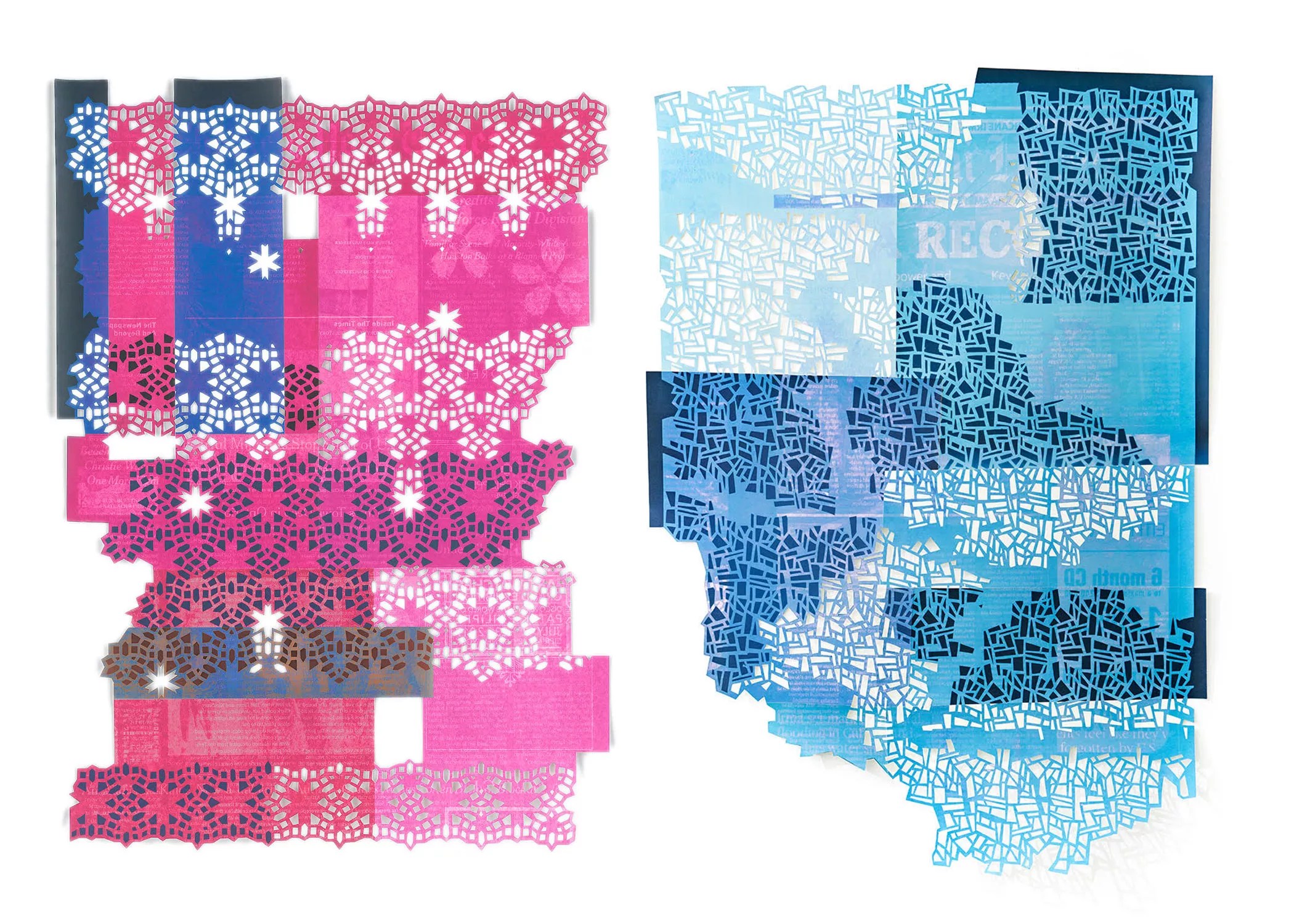 Wrapping the literal edge of the gallery are Alfonso’s translated ladder-like charcoal and graphite forms, which the viewer is invited to walk in and around. The structures are repeated on the opposite wall of the space in a suite of nine intimately sized compositions. Ruff’s work juxtaposes the delicacy of a morning newspaper with dainty, lace-like doily constructions, encased behind glass for visitors to peer in upon; it becomes a scavenger hunt to try and discern words that are obstructed from legible view.