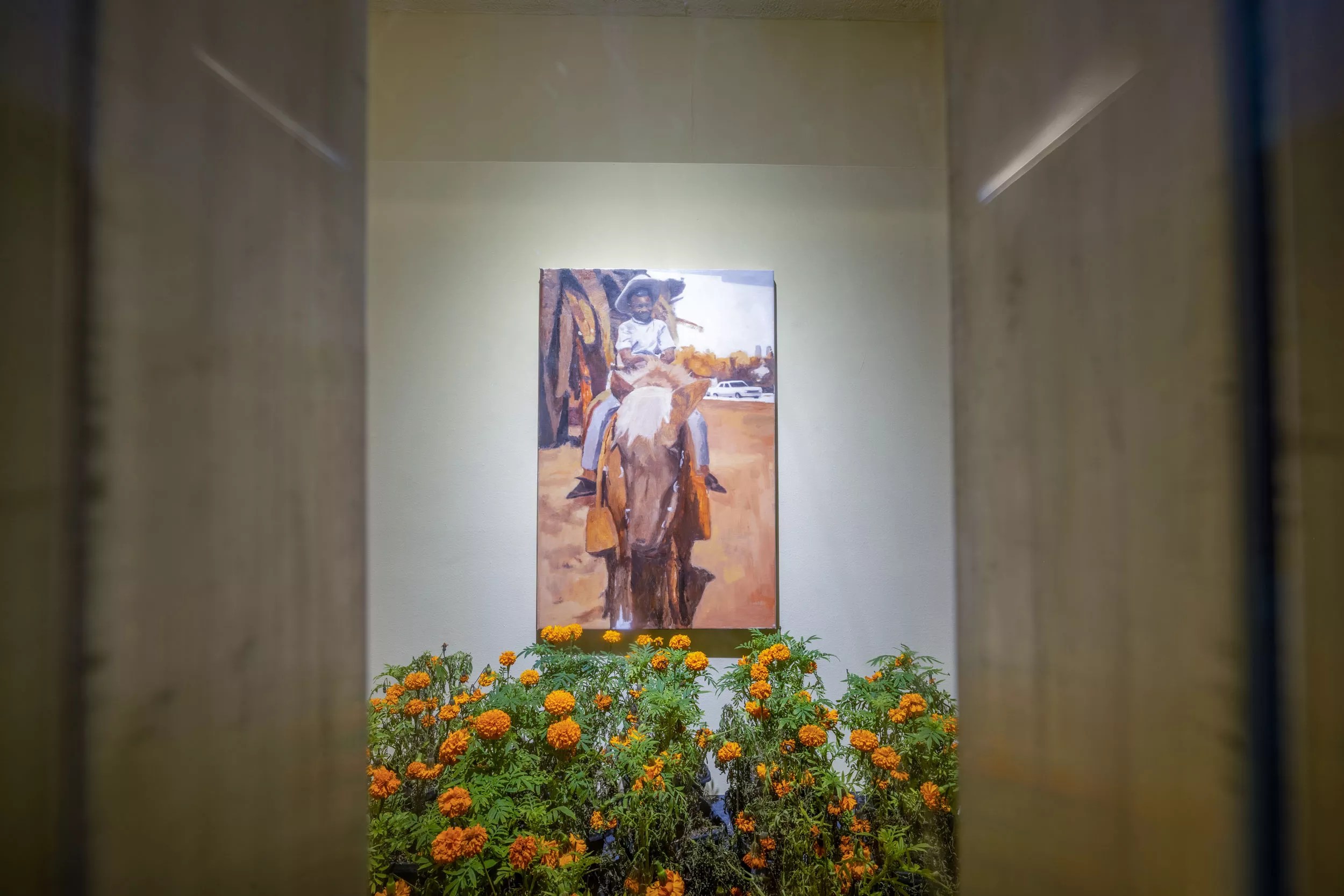 The tunnel-vision ordeal of encountering O’Neal’s 18 years and counting forces the viewer to peer through a narrow slit into a dying field of bouquets lined up in front of a portrait of the artist’s father. The domestic structure of the mixed-media sound installation serves as a homage to the lives affected by family members in the prison system or other incarcerated circumstances.