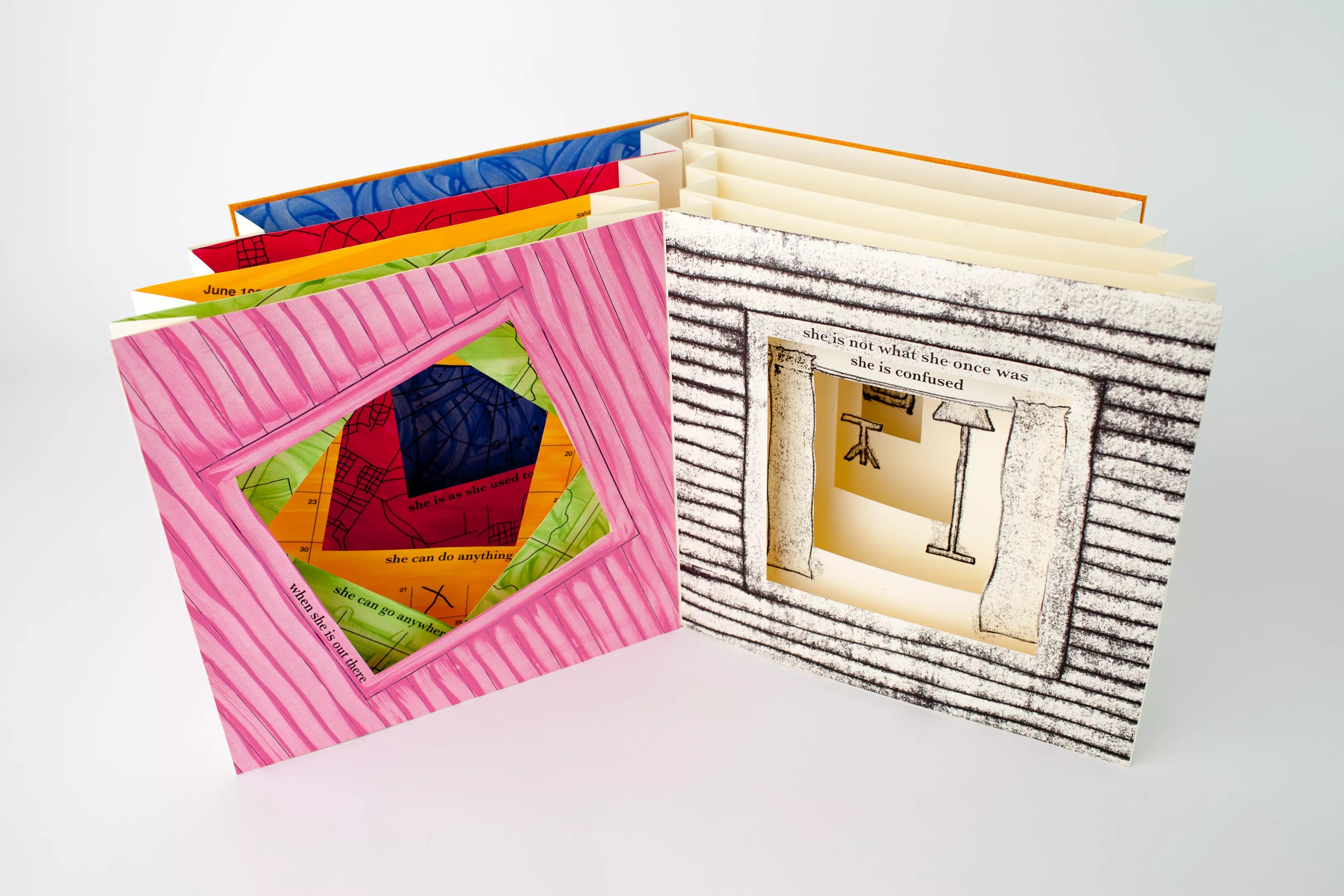 “Due to the ubiquity of books in our everyday life, book artists have the opportunity to subvert viewers’ expectations of what a book can do while luring viewers in through the familiarity of the form,” she says. “As a book artist myself, I enjoy the way that artists’ books allow me to play with narrative sequence. Pages turn, and each image or block of text plays off of the spread before it and introduces the following spread. Sometimes, this transition can be abrupt or jarring, and sometimes, the sequence comes together like a smooth melody with ideas and images waxing and waning throughout the narrative.”