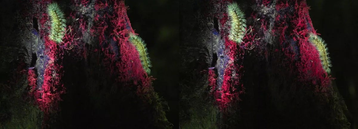 Awavena tells the story of a woman breaking the glass ceiling of the male-dominated Shamanism of her village. During that personal and social drama, there are moments where you find yourself looking at things like a river basin and seeing beyond the element of water. There is also a long moment where you can gaze into an ancient tree and see a rainbow of color. As your eyes trace the trunk, the globule of color follows your field of vision. It’s a trick of the eye, explains Narvaez, built into the fact that you are watching the images practically right on the bridge of your nose.