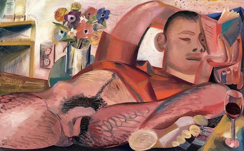 Providing contrast to the coldness in the figures in Gangloff’s canvasses, Fratino show moments of sensual vulnerability in his pieces. His abstract figures are not meant to capture reality in the objective sense, but rather provide a glimpse into the artist’s inner world. Through his hazy, dreamlike lens, the renderings seem to be awash in languor. Like Gangloff, Fratino skirts the line between the real and abstract, striking a delicate balance in each painting. Though starkly different in tone and composition, both artists’ work
