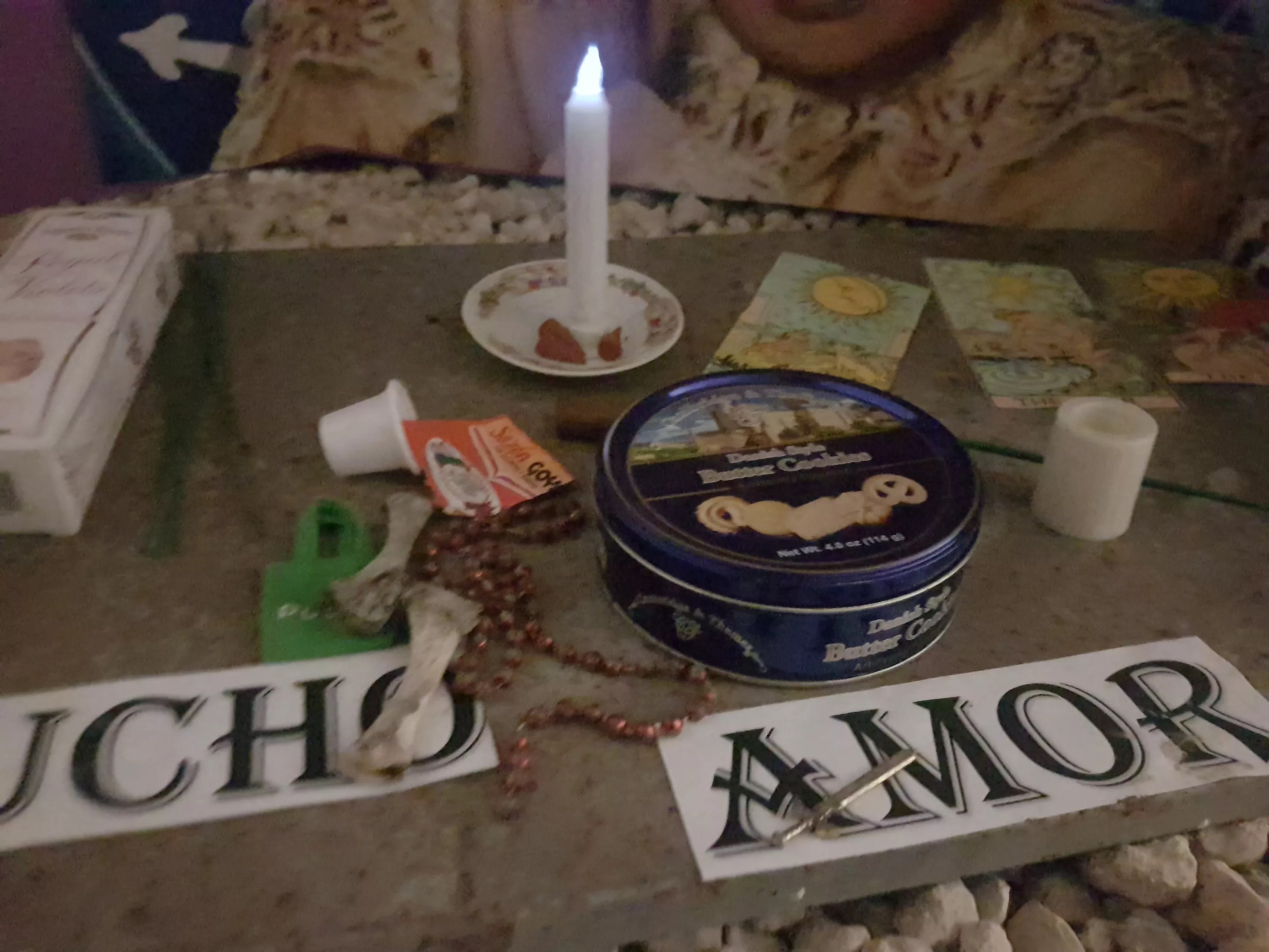 A printed image of Mercado is the centerpiece of the tribute, and below it lies a variety of offerings. Some include Mercado trademarks, such as the words “Mucho Amor” and a set of mini tarot cards. Whoever created the shrine got creative by embellishing it with quintessential Miami iconography such as a small Café Bustelo bag, a mini green Publix bag, a bottle of Royal Violets perfume, an incredibly tiny Goya sazón packet, and an equally wee Royal Dansk Danish butter cookie tin (famously used by Latino families to store anything but Danish butter cookies).